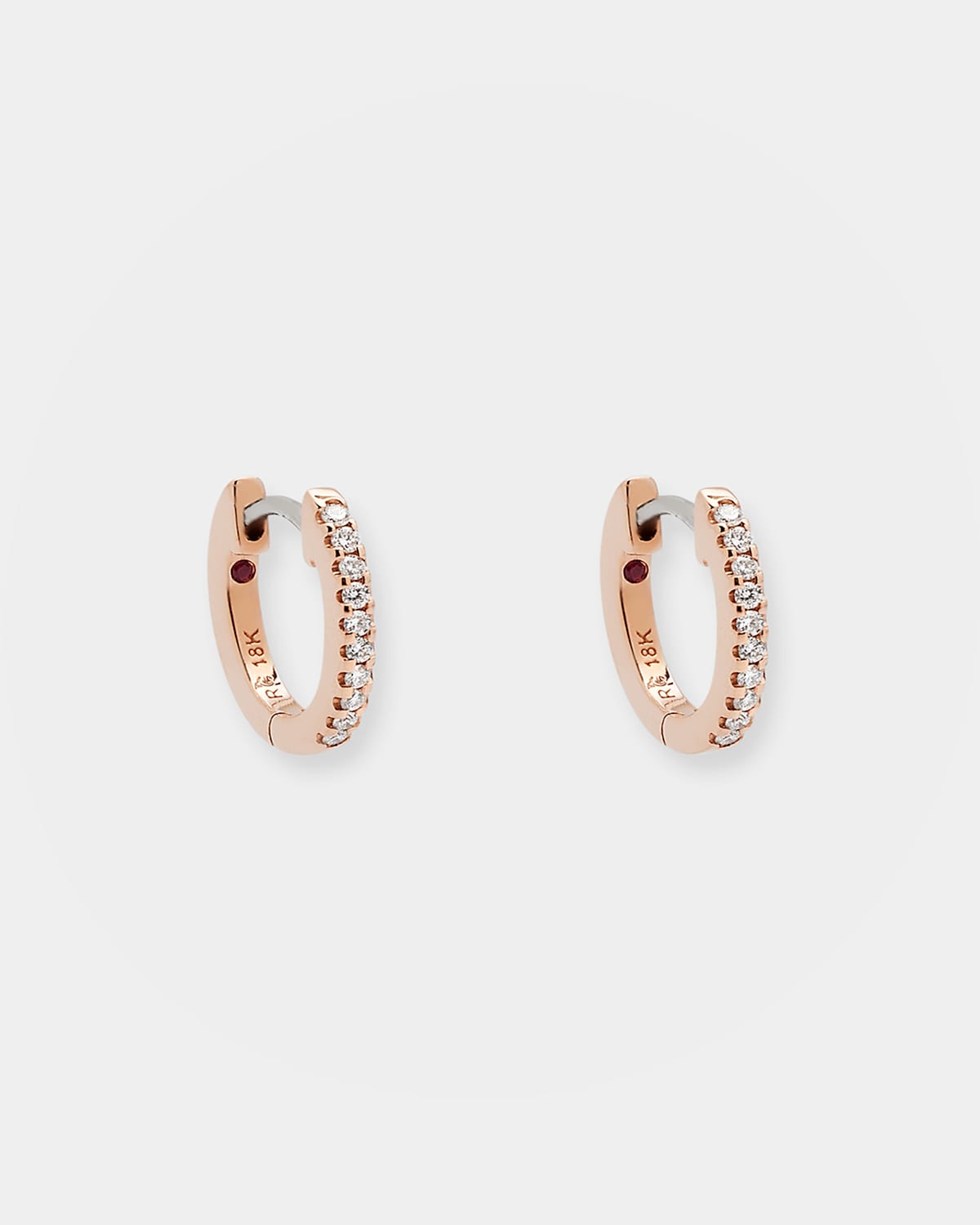 Mini hoop earrings by Roberto Coin to complement that 2nd and 3rd hole 18karat white gold, rose gold, or gold. Micro pavé diamonds. 0.09 total diamond carat weight. Roberto Coin signature hidden synthetic ruby. For pierced ears. Post backs. Made in Italy.