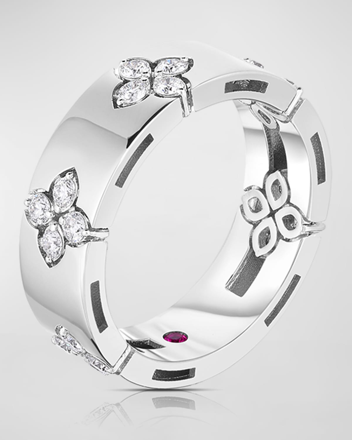 Roberto Coin band from the Love in Verona Collection Approx. ring size 6 Brushed 18karat yellow gold Flower motifs with white diamonds 0.45 total diamond carat weight Signature hidden genuine ruby Handcrafted in Italy