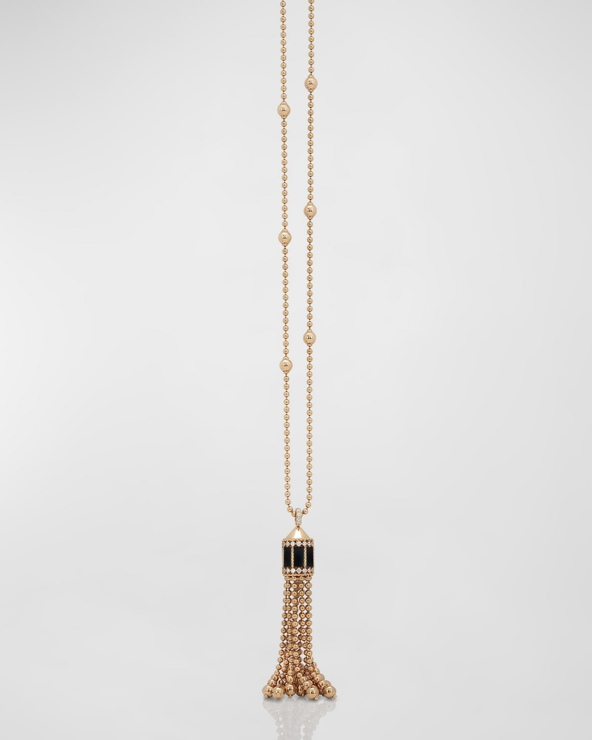 18r di blk/jade artdeco tassel Roberto Coin in 18karat gold and diamond Necklace length: approx. 32 inches Adjustable length Lobster clasp Diamond; total carat weight: 0.43 CTW white Diamond Made in Italy