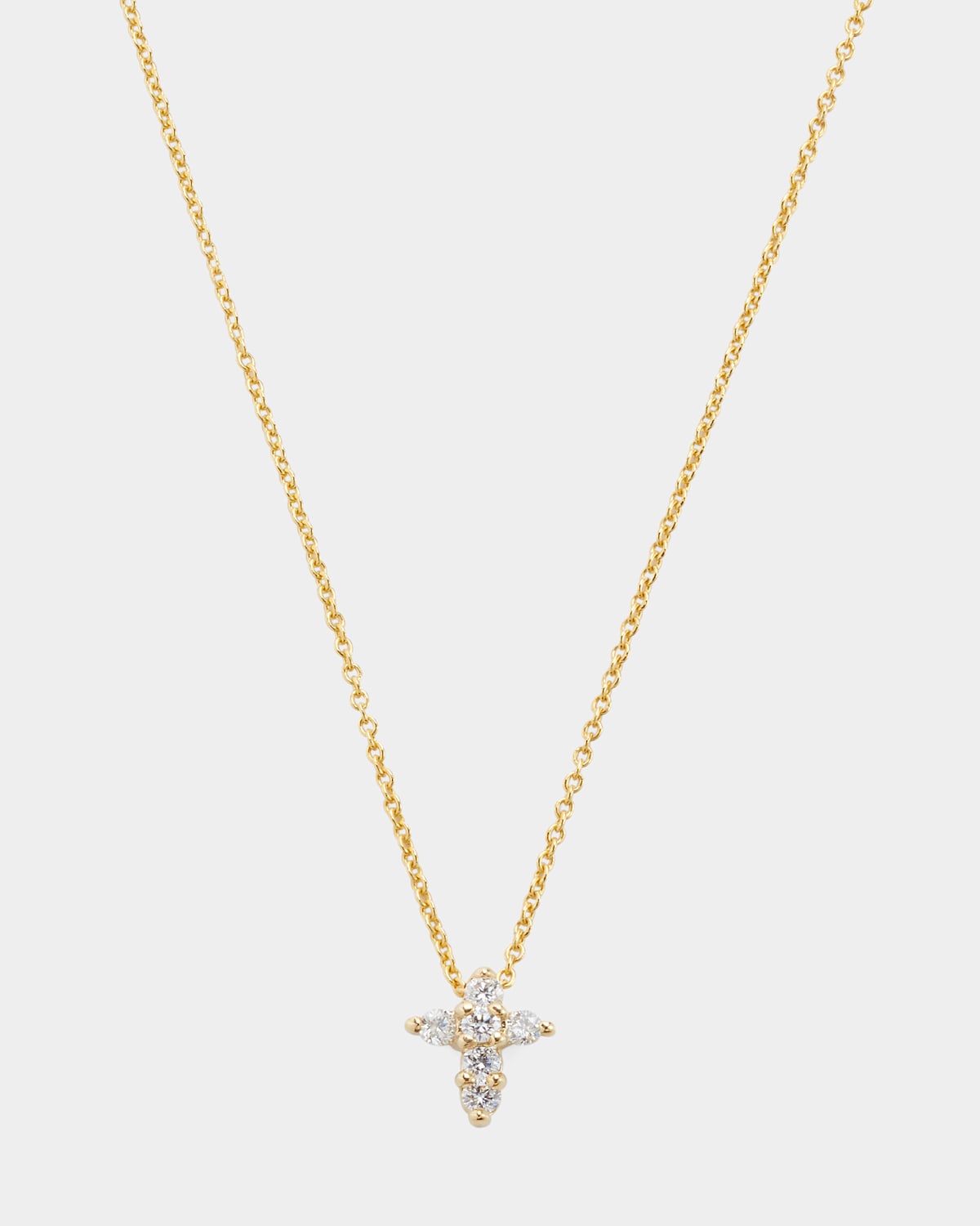 18karat gold necklace by Roberto Coin. Cross pendant with diamond insets; 0.11 total carat weight*. *All gemstone carat weights (ct. t.w.) are approximate; variance may be 0.05 carat. Interior of jewelry piece includes signature synthetic ruby detail. Lobster clasp. 16"L; 2" extender with lobster clasp. Made in Italy.