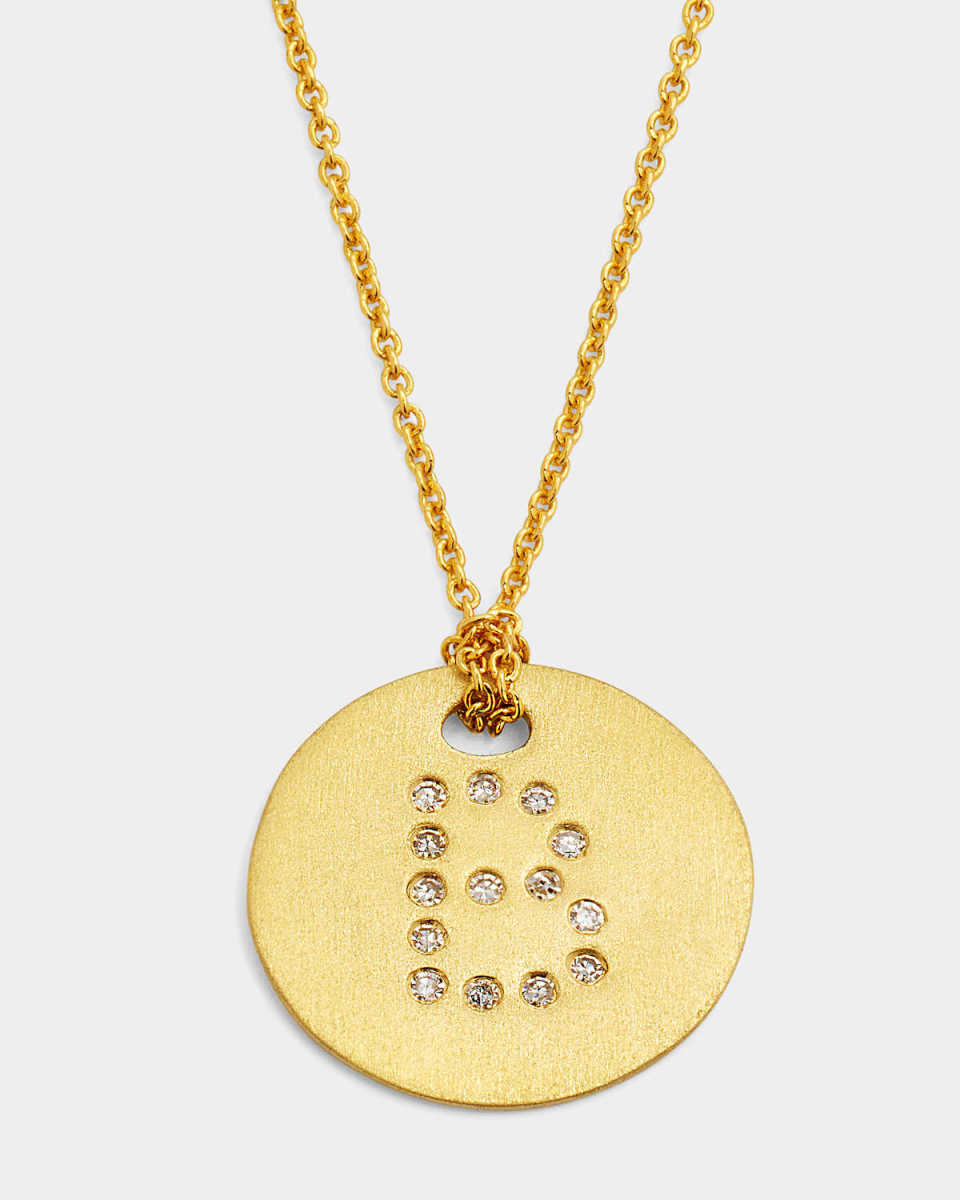 Pave white diamonds spell a letter of your choosing, approx. 1/2" diameter. 18karat yellow gold rolo chain, approx. 18"L. Total carat weights vary by letter. 0.03 total carat weight for T, L, I, F. 0.04 for Y, V, Q, P, K, J, E, C, A. 0.05 for Z, X, W, U, S, R, N, M, H, G, D, B. 0.06 for O. Lobster clasp.