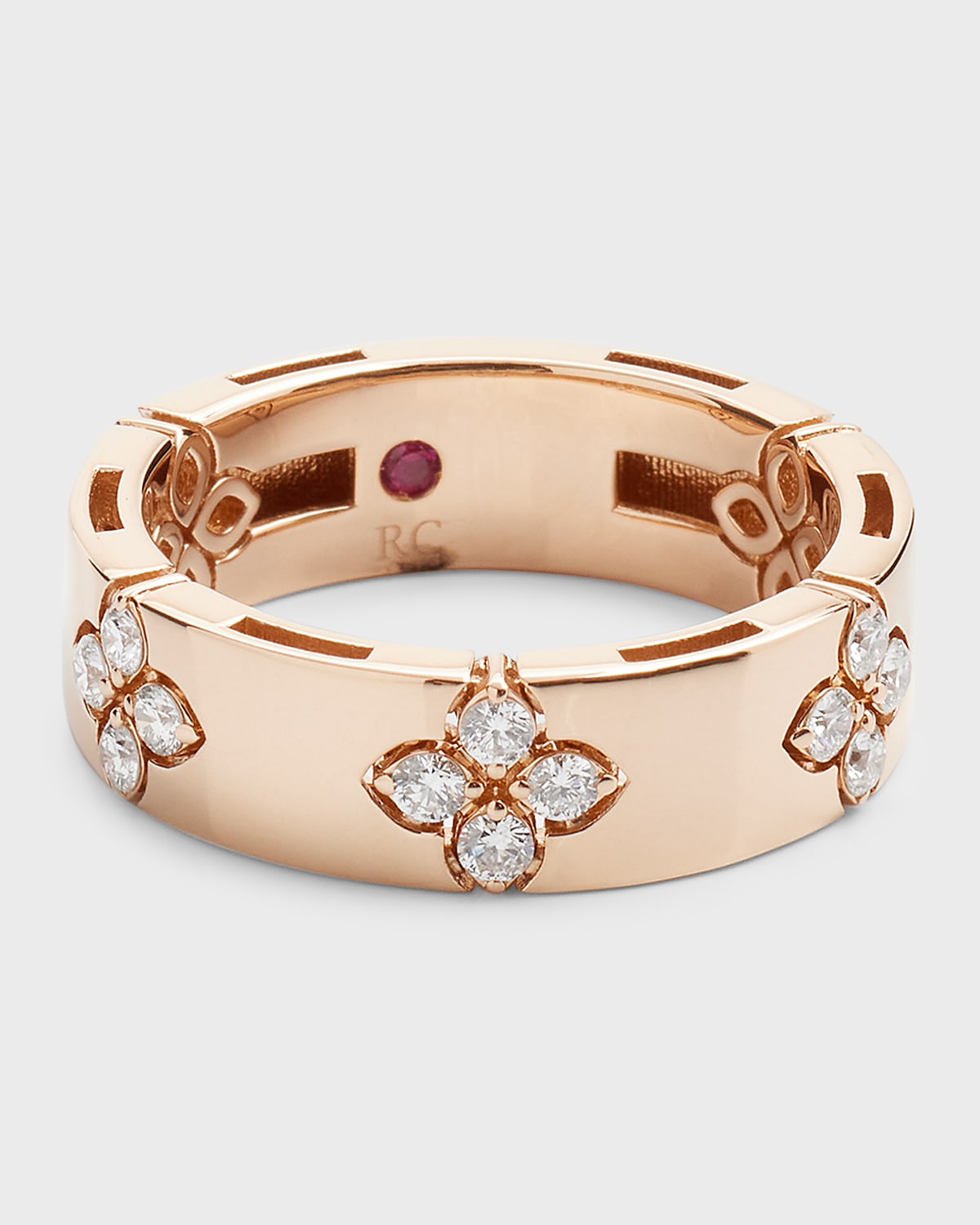 Love in Verona ring from Roberto Coin. 18karat rose gold band and settings. White diamond rounds form flowers. 0.45 total diamond carat weight. Signature hidden synthetic ruby. Approx. 5mm wide. Handcrafted in Italy.