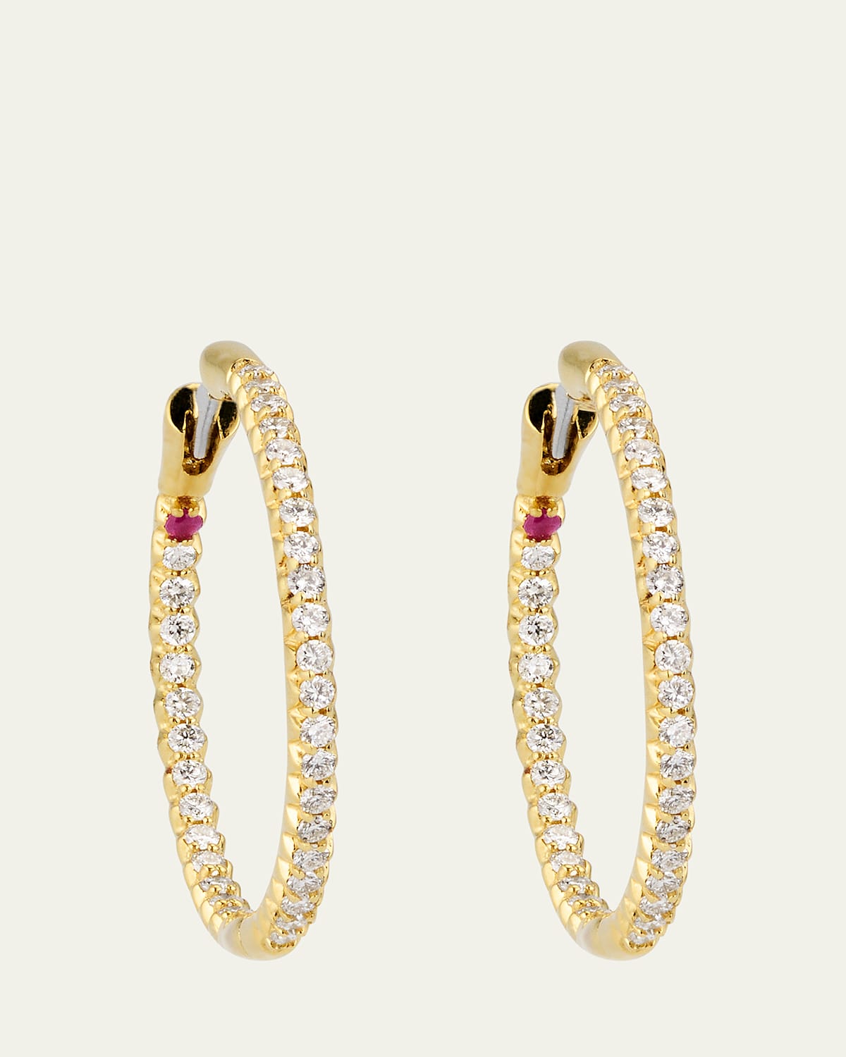 18karat yellow gold hoops. Pave diamonds, 0.59 total carat weight. Signature ruby on each hoop. 18karat white gold post backs. 1" diameter. Made in Italy.