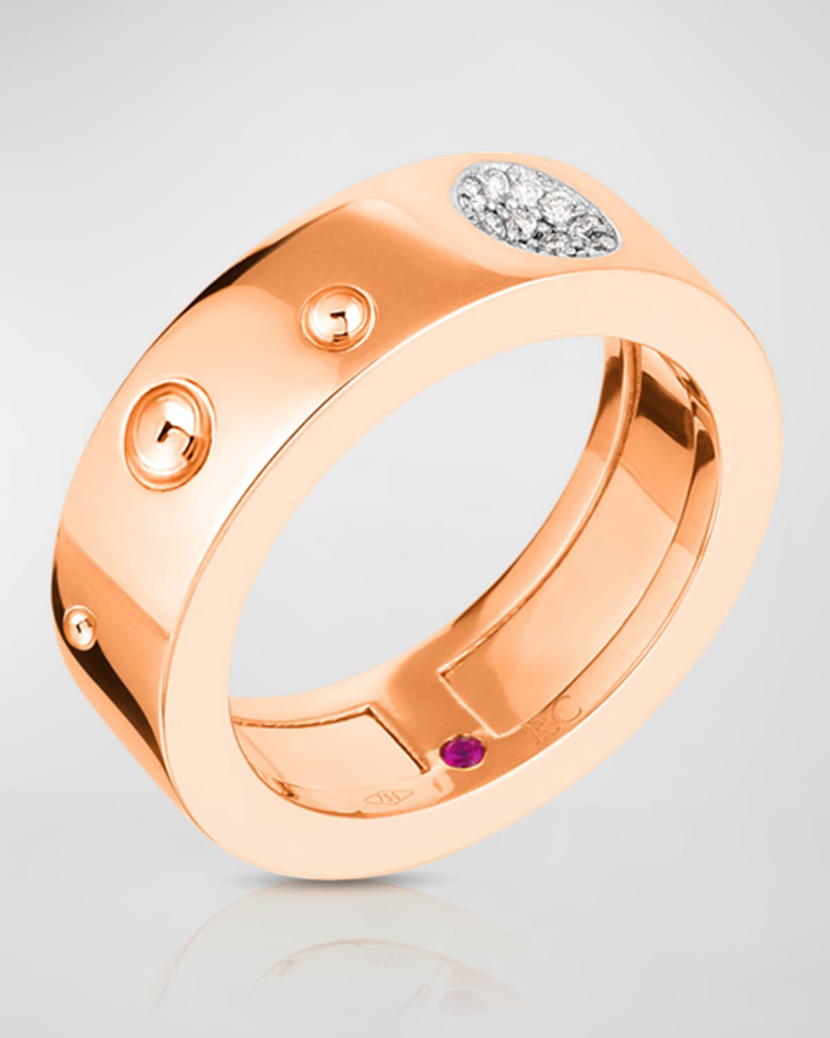 Handcrafted to perfection for celebrating those special moments, this piece is a beautiful wedding band option. Pois Moi Luna band ring by Roberto Coin. Polished 18karat rose gold band. White diamond pavé circle detail. 0.07 total diamond carat weight. Signature hidden ruby. Made in Italy.