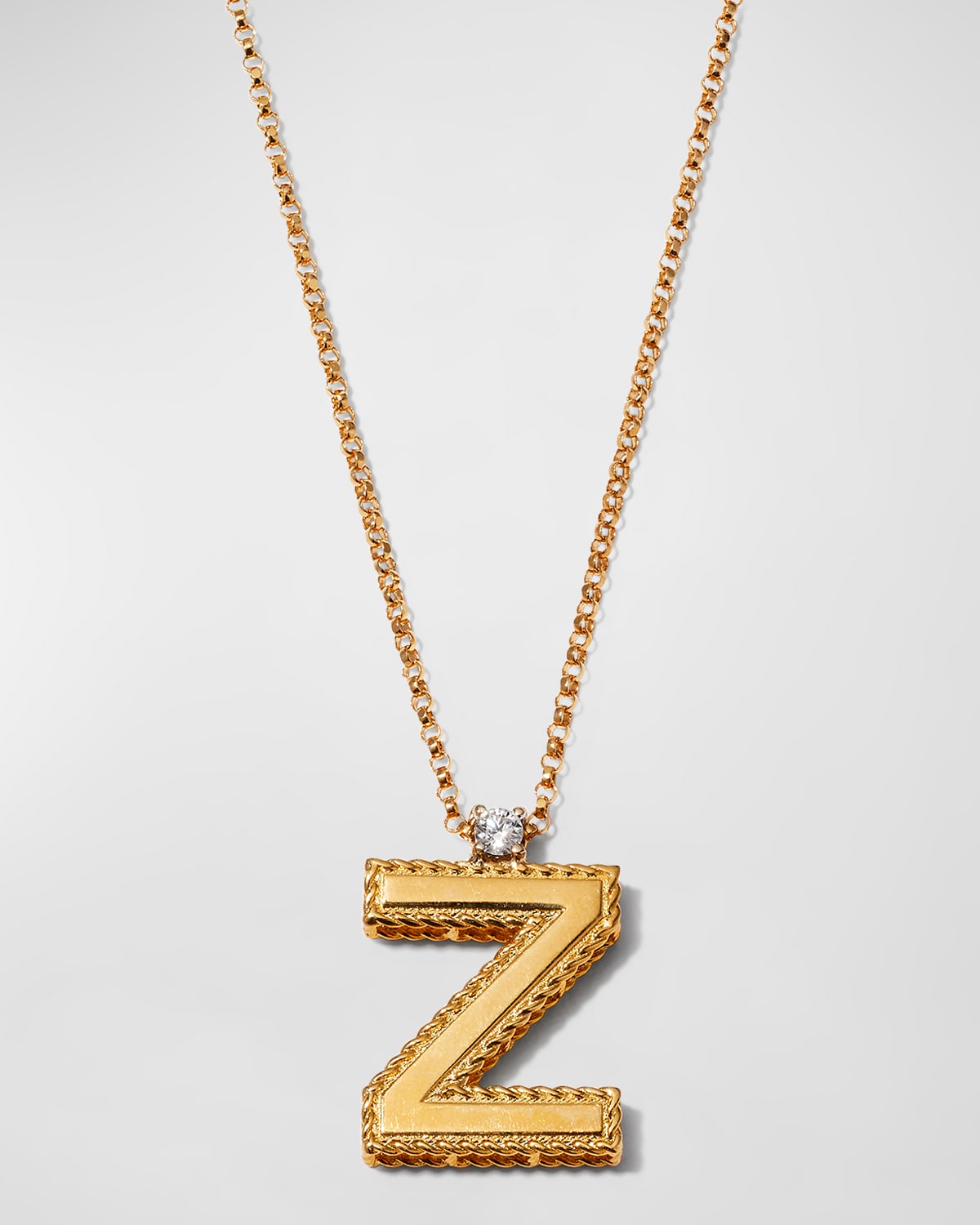 Roberto Coin necklace from the Princess Collection Approx. 16" chain; 0.6" initial pendant 18karat yellow gold rolo chain Top link with single diamond detail 0.04 total diamond carat weight Signature hidden genuine ruby Adjustable length Lobster clasp Made in Italy