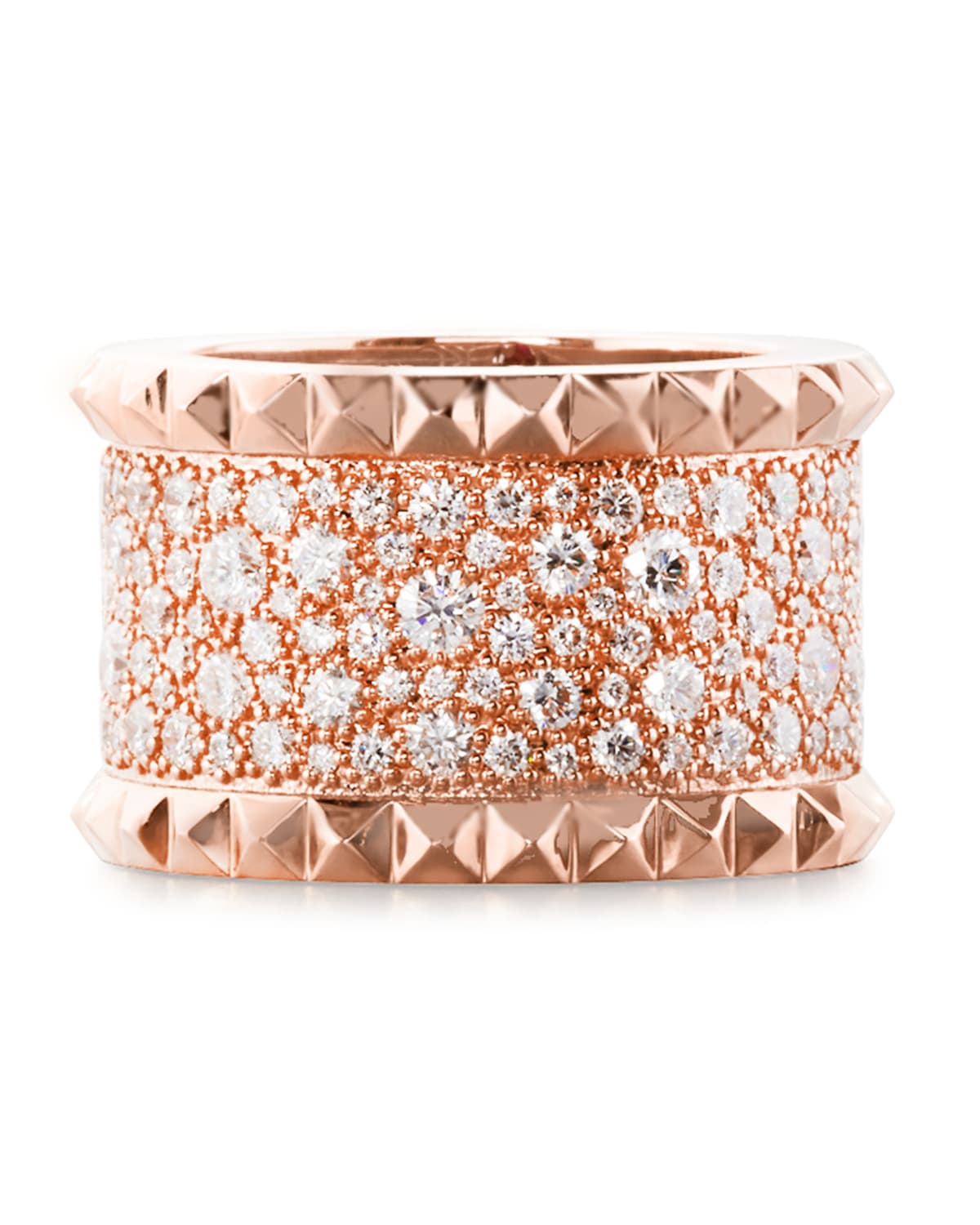 EXCLUSIVELY AT NEIMAN MARCUS Roberto Coin ring from the ROCK amp; DIAMONDS Collection. 18karat yellow gold. Pyramid studs trim outer edges. Pavé white diamonds. 1.72 total diamond carat weight. Approx. 0.6"L face. Roberto Coin signature hidden 0.3carat ruby. Made in Italy.