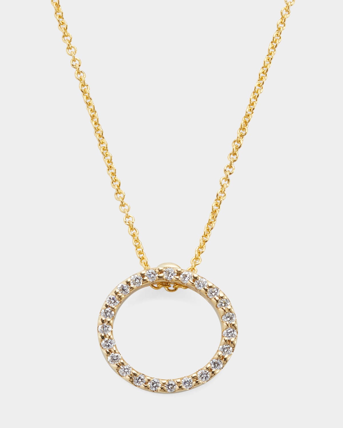 Roberto Coin "Circle of Life" necklace. From the Tiny Treasures Collection. Your choice of white, yellow, or rose gold. Circle pendant with prongset white diamonds. 0.09 total diamond carat weight. Approx. 16-18"L. Lobster clasp. Roberto Coin signature hidden synthetic ruby. Made in Italy.