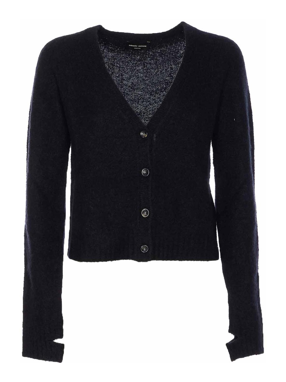 Cardigan noir Roberto Collina avec boutons frontaux, col en V, manches longues, découpes sur les poignets Nom de la couleur du créateur: noir