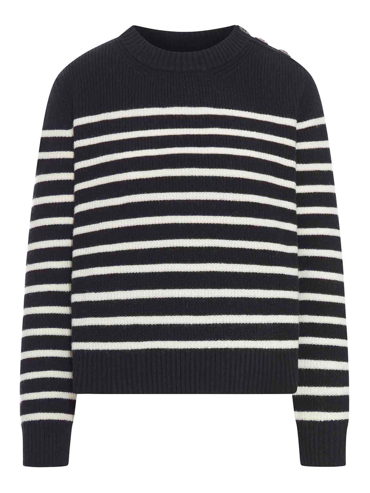 Col rond, ouverture d'épaule boutonnée, manches longues, ourlet droit, maille entièrement côtelée, motif rayé, - couleur noire