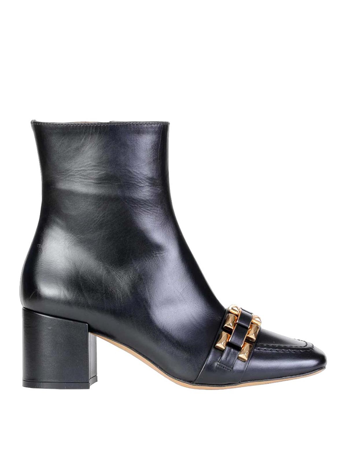 La bottine Avila en cuir de veau noir et montée sur un confortable bloc de chaînes dorées et de bandes noires entrelacées met en valeur le chic bout carré et rehausse vos tenues d'hiver avec ce modèle de Roberto Festa.