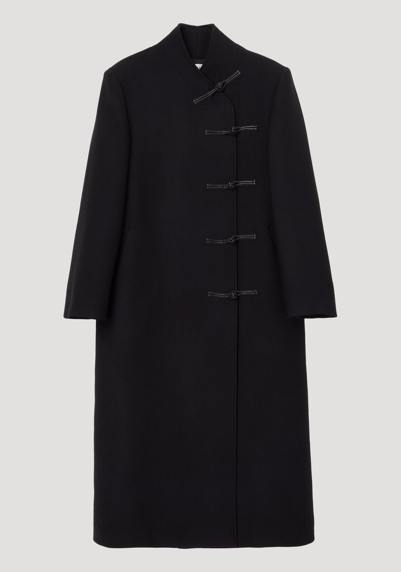 A timeless outerwear piece elevated through subtle details, this long coat features our signature mandarin closures reinterpreted in an asymmetric front design. Crafted from pure virgin wool with a minimalist cut, it blends tradition and modern refinement.