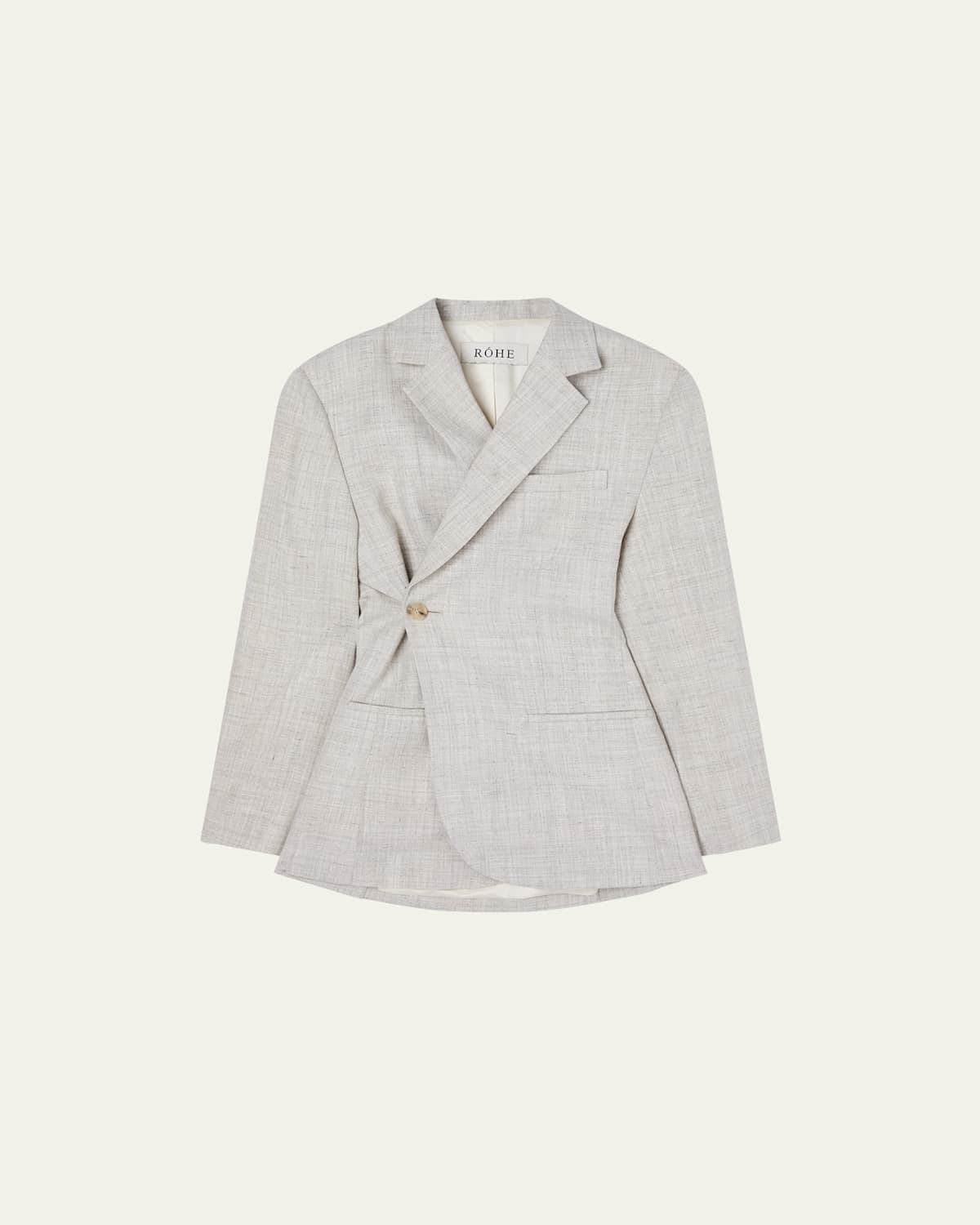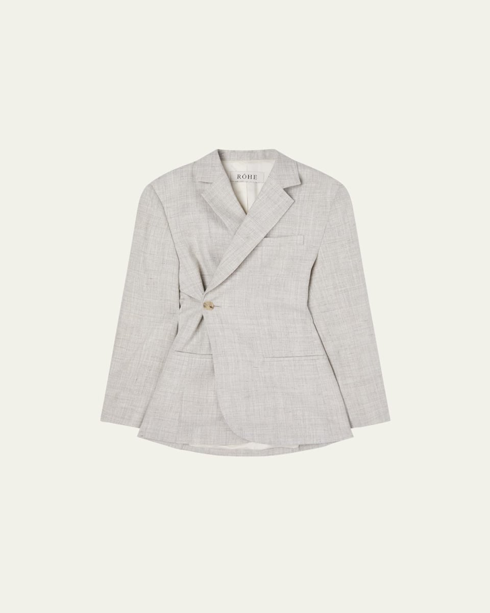 Rohe Women lightweight linenviscose blazer featuring an overlapping front Notched lapels Singlebreasted front Long sleeves Welt pockets Tailored fit Doublevented back Buttonfront Viscose/linen/polyester Lining: Viscose Hand wash or dry clean Made in Italy