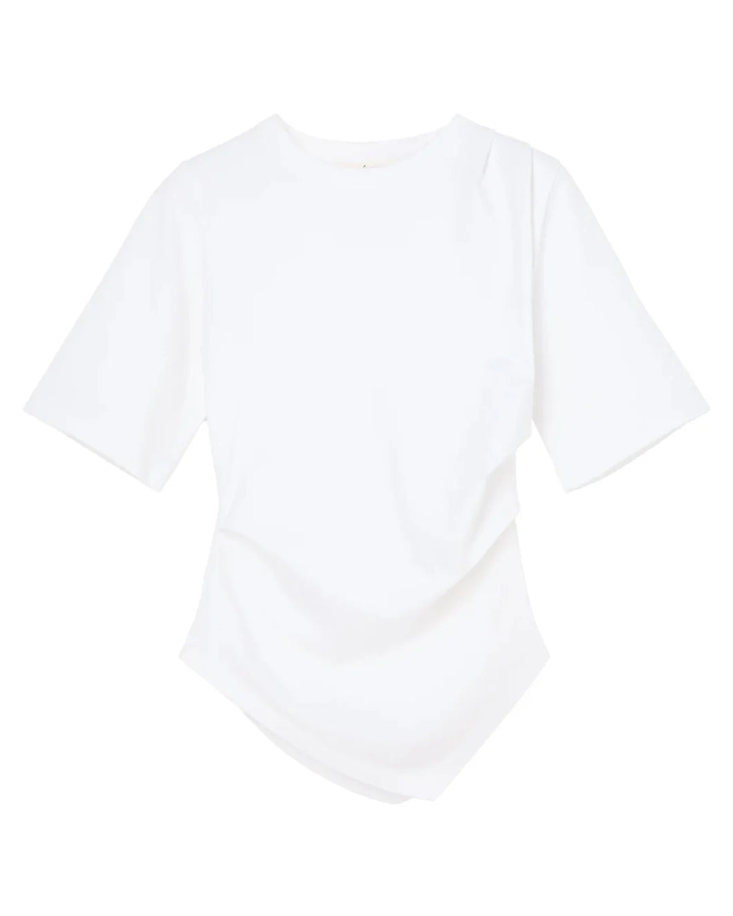 The Reinvented Twisted T-Shirt in White by Rohe is a sculptural update to a classic staple featuring a twisted asymmetrical drape that contours the waist, and elbow-length sleeves. 100% Organic Cotton The model is 179cm and is wearing a size EU 36