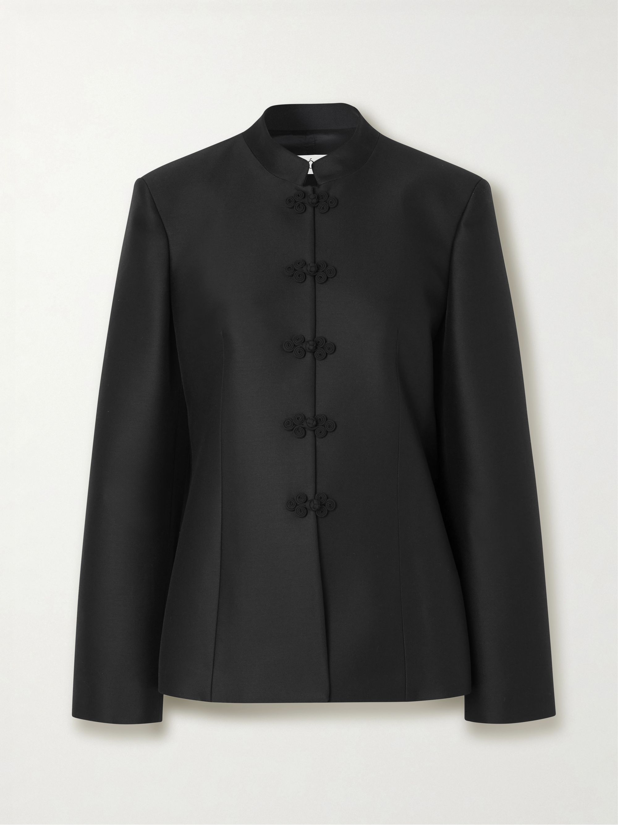 RÓHE's jacket fuses understated tailoring with architectural precision. Cut from wool and silk-blend twill, it's nipped in at the waist to define your curves and topped with a neat stand collar. The swirling pankou closures add a pretty finishing touch.