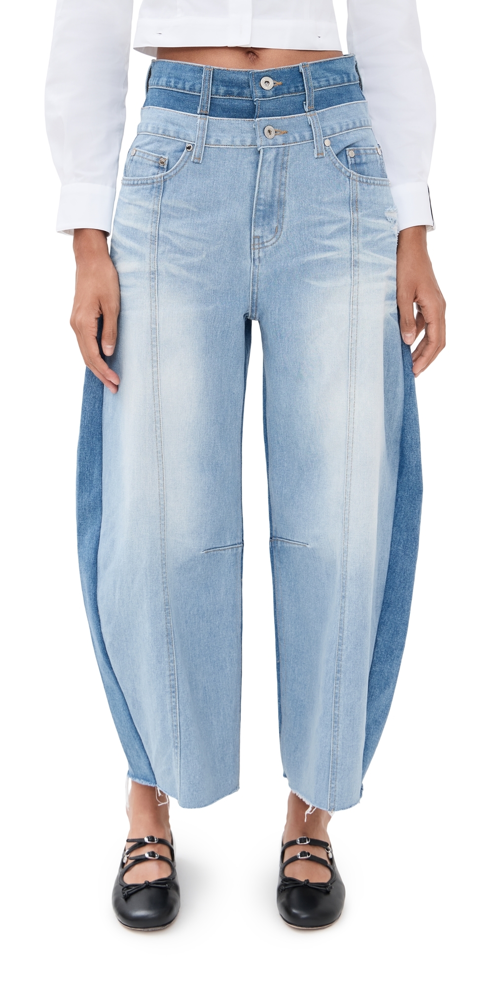Fabric: Mid-weight, non-stretch denim. Two-tone denim. Layered design at waist. Raw hem. Button closure and zip fly. 5-pocket styling. Shell: 100% cotton. Dry clean. Imported, Korea. Measurements: Measurements from size 36 Rise: 13.75in / 35cm Inseam: 26.5in / 67cm Leg opening: 23.5in / 60cm