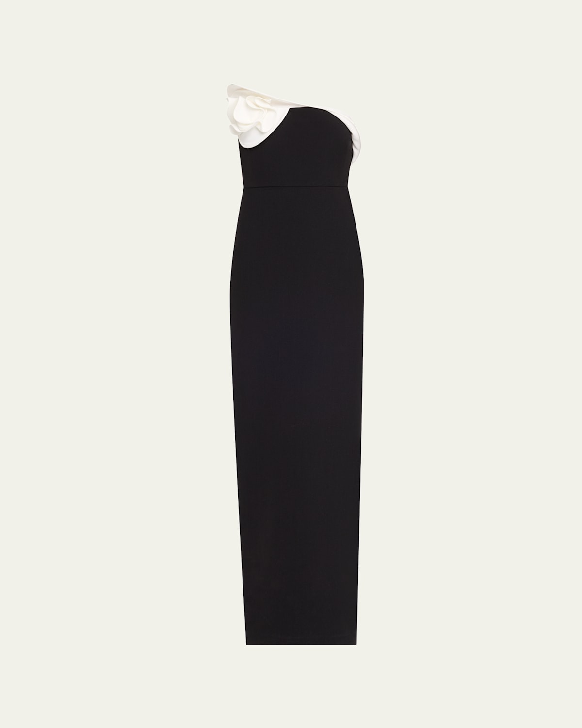 Crepe Roland Mouret gown with stretch showcases a contrast flower drape panel Strapless neckline Sleeveless Column silhouette Long length Back hem slit Zip closure Slit Length (inches): 15.7 Polyester/viscose/elastane Lining: Polyester Spot clean Imported