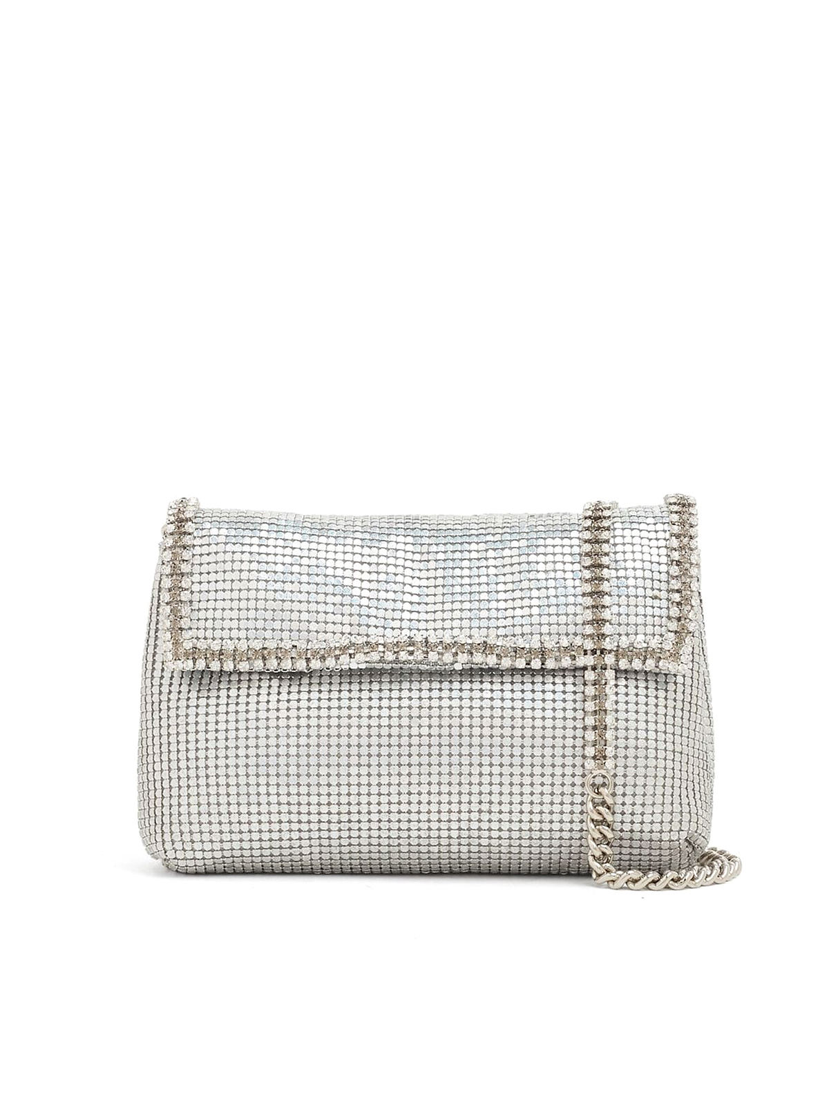 Sac en filet orné de cristaux de Rosantica avec lambris en maille de cristal argenté, ornements en cristal, plaque logo argentée, bandoulière à maillons de chaîne, haut rabattable avec fermeture magnétique, compartiment principal et doublure complète