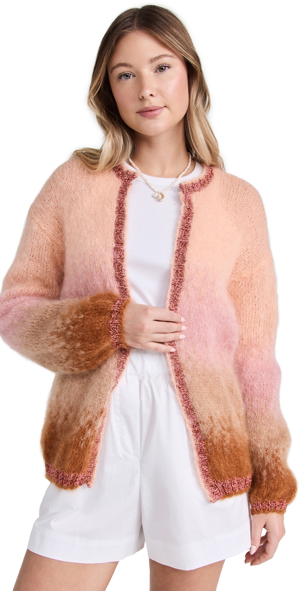 Fabric: Lightweight fuzzy knit. Ombre design. Metallic threading at edges. Crew neck. Long sleeves. Open placket. Shell: 70% mohair/30% polyamide. Hand wash. Imported, Romania. Measurements: Length: 24.75in / 63.0cm, from shoulder