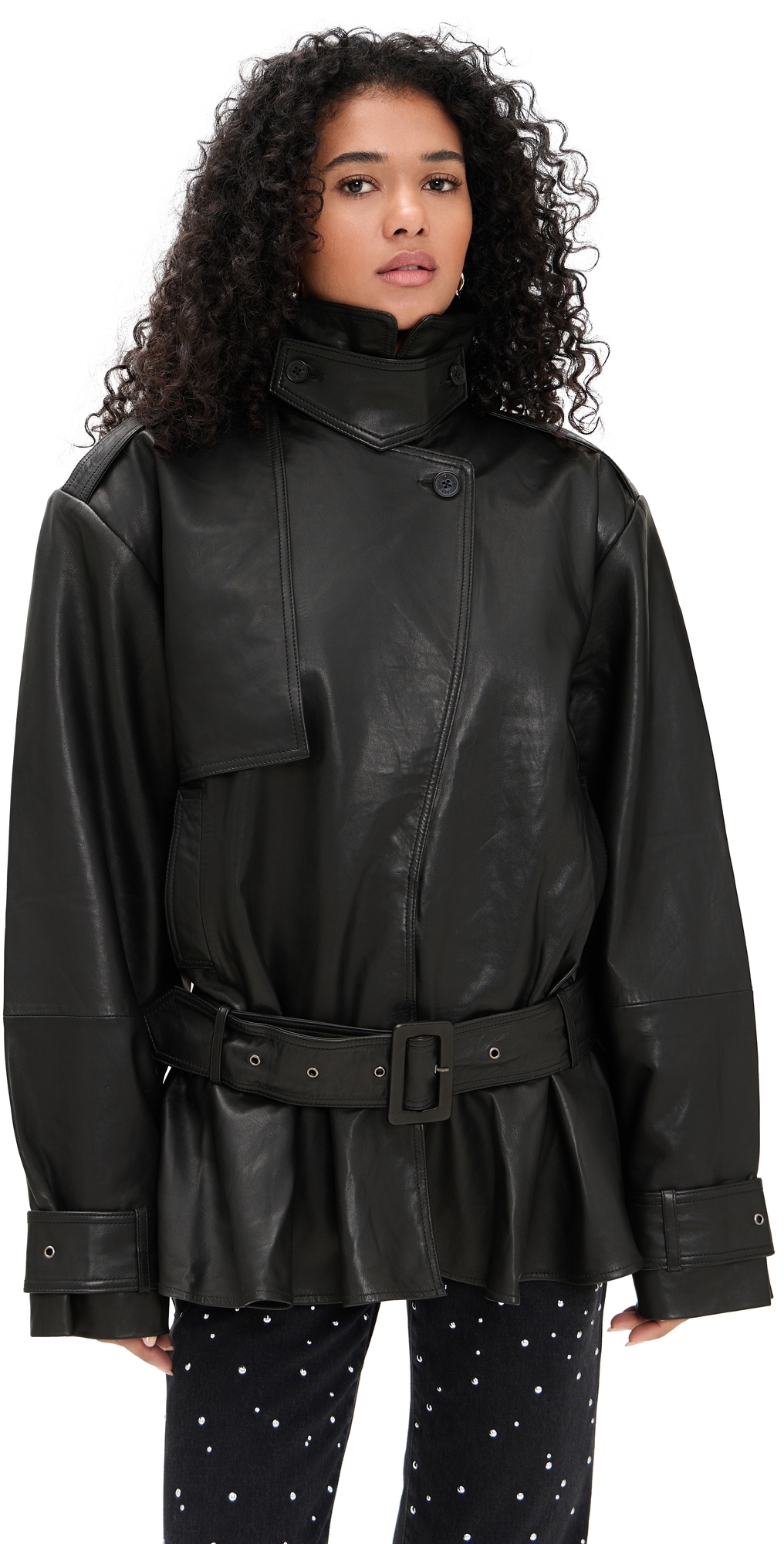 Fabric: Mid-weight, non-stretch leather. Adjustable buckle tabs at cuffs. Collared neck. Long sleeves. Button closure and zip fly. Welt front pockets. Shell: 100% lambskin. Lined. Lining: 100% polyester. Leather clean. Imported, India. Measurements: Measurements from size 34 Length: 29.5in / 75.0cm, from shoulder