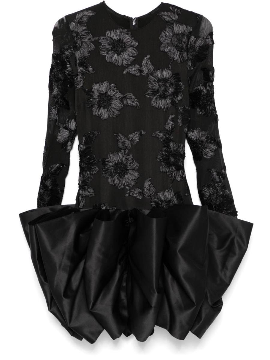 black concealed rear zip fastening branded zip puller mesh design floral embroidery round neck long sleeves voluminous skirt pleat detailing full lining high-low hem