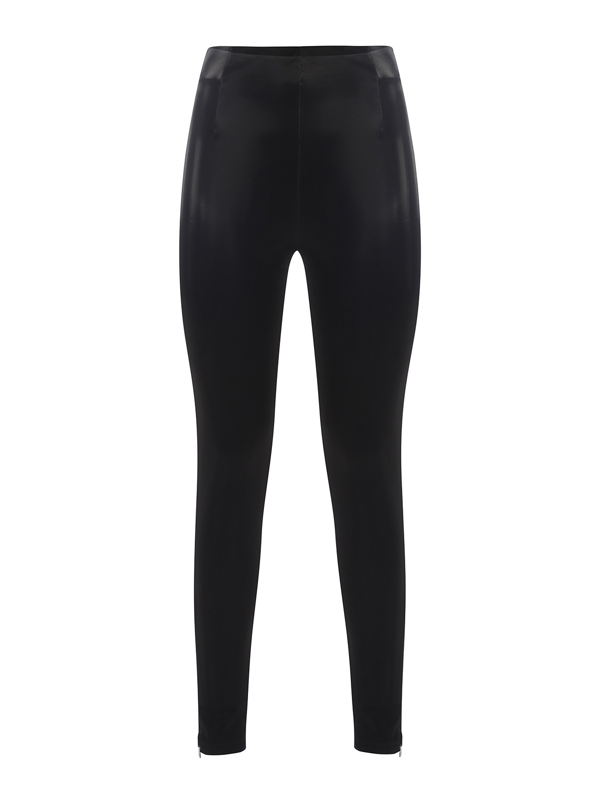 Leggins rotatifs en vinyle noir, fermeture zippée latérale, matériau enduit, coupe ajustée, jambes droites, fermeture éclair sur le bas, 95 % polyester, 5 % élasthanne