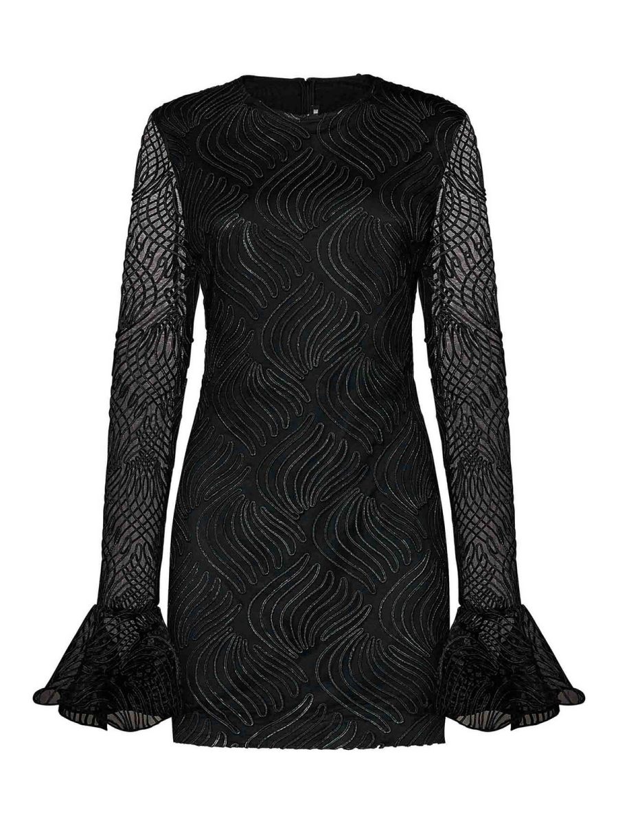 Fermeture éclair dissimulée au dos ou tirette zippée à logo, col rond, manches longues, semi-transparentes, détails volants aux poignets, doublure en D, coupe moulante, couleur noire