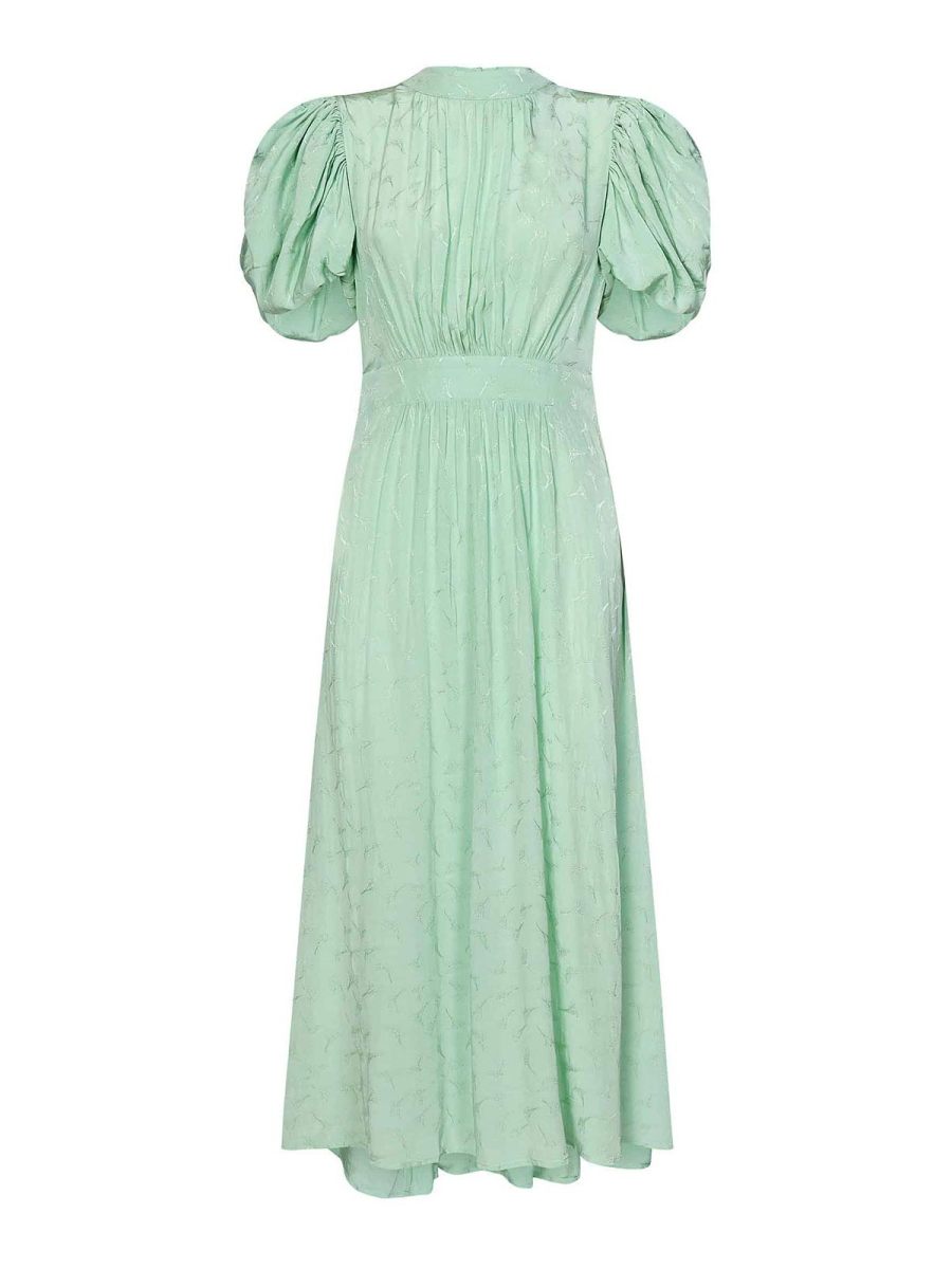 Cravate ajustable, col montant, manches courtes, manches bouffantes, taille ajustée, froncée au niveau du dos, empiècement smocké, couleur vert aqua