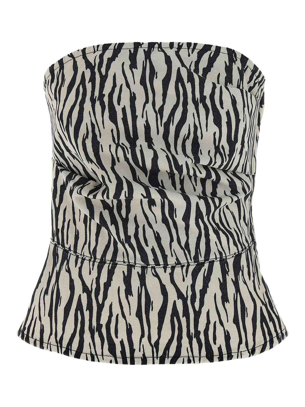 haut en jean de coton sans manches en jean imprimé avec imprimé animalier, boucles, modèle sans manches à épaules dénudées, fermeture zippée latérale.durable: ce produit est fabriqué en coton biologique.