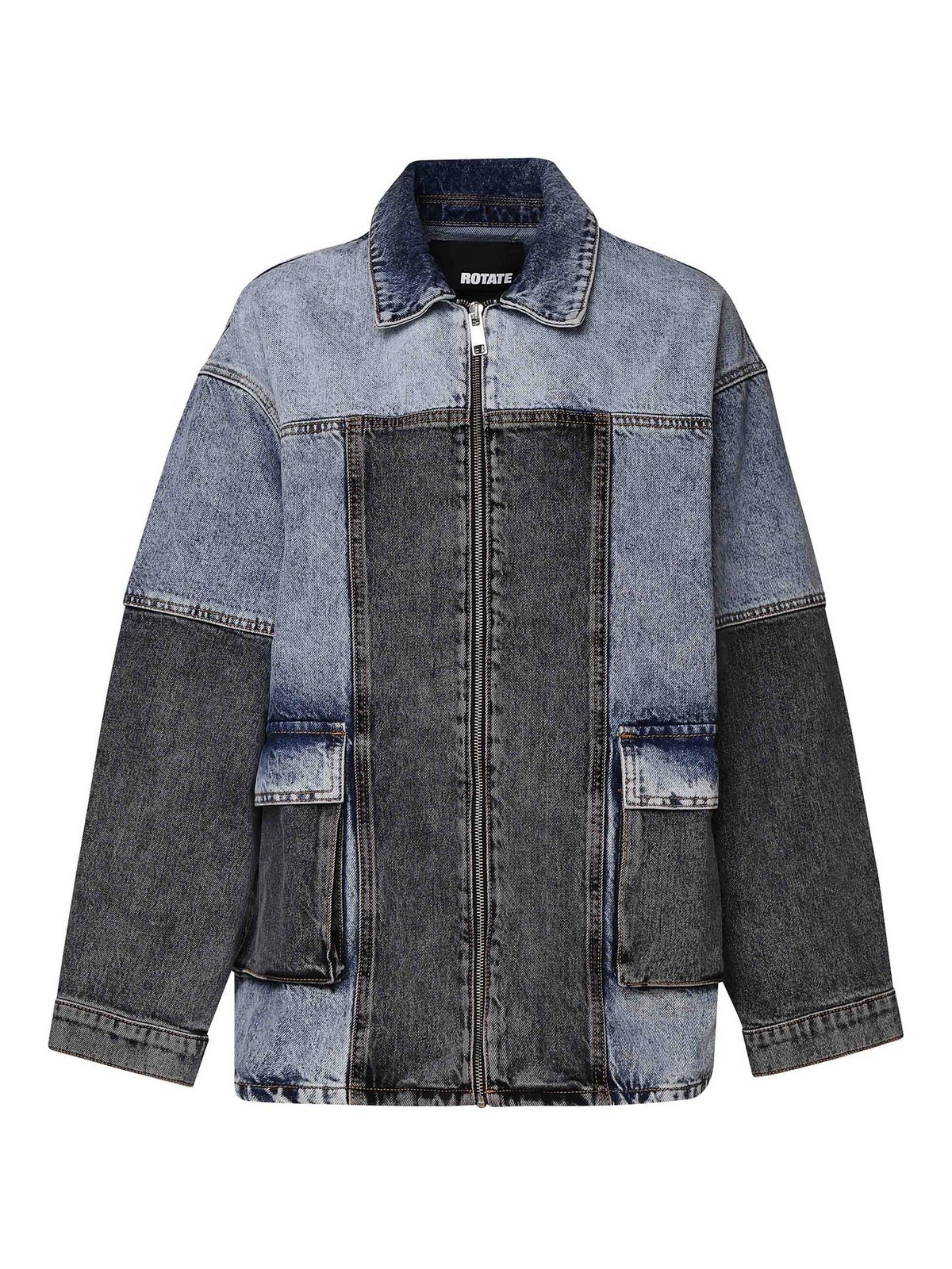 Veste en jean patchwork, fermeture éclair, col chemise, grandes poches latérales à rabats, couleur multidenim
