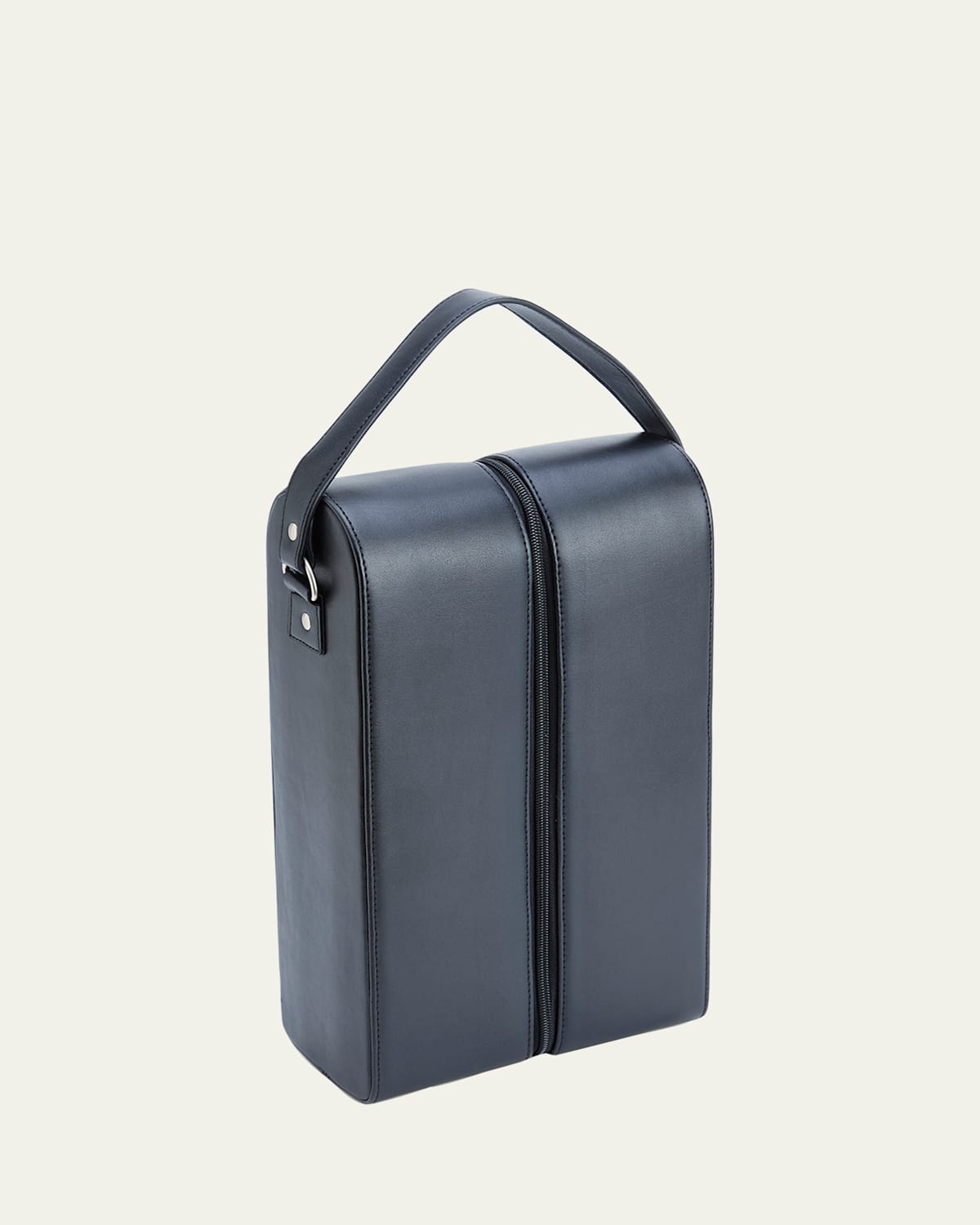 A must for the ardent wine connoisseur, this case regally transports two bottles in wellpadded splendor. This luxury suede lined genuine leather case features a convenient carrying handle and zip around design. Includes stainless steel wine steward's corkscrew/bottle opener. Handmade construction. Complimentary monogramming in style shown. Imported.