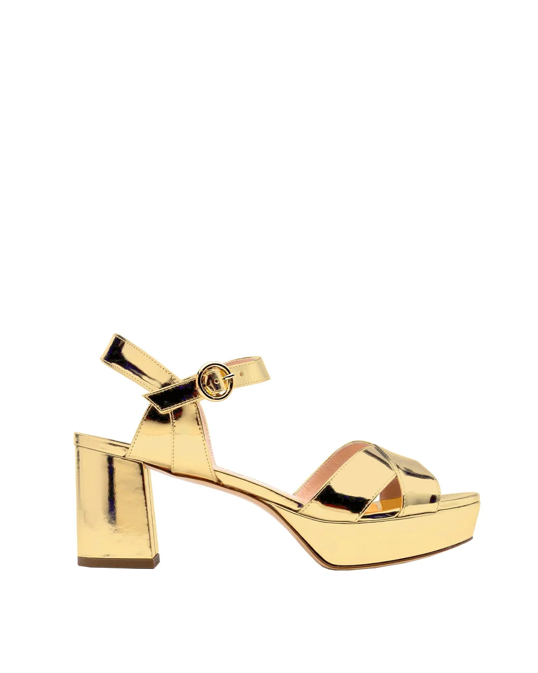FINAL SALE The Deidre Sandal in Gold by Rupert Sanderson is a low platform, block heeled sandal featuring crossover straps and buckled ankle strap. 100% Goat Leather 75mm block heel and 30mm platform Made in Italy #RES20-23