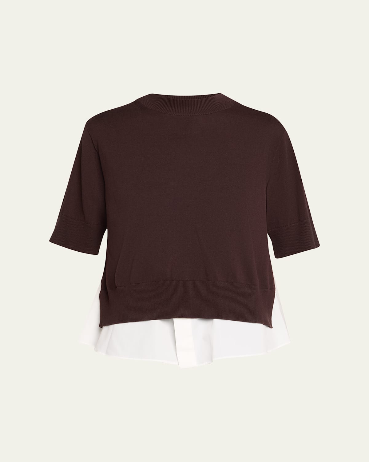 SACAI knit sweater layered with a peekaboo cotton shirttail hem Crew neckline Short sleeves; ribbed cuffs Relaxed fit Shirttail hem Pullover style Cotton/polyester Dry clean Imported