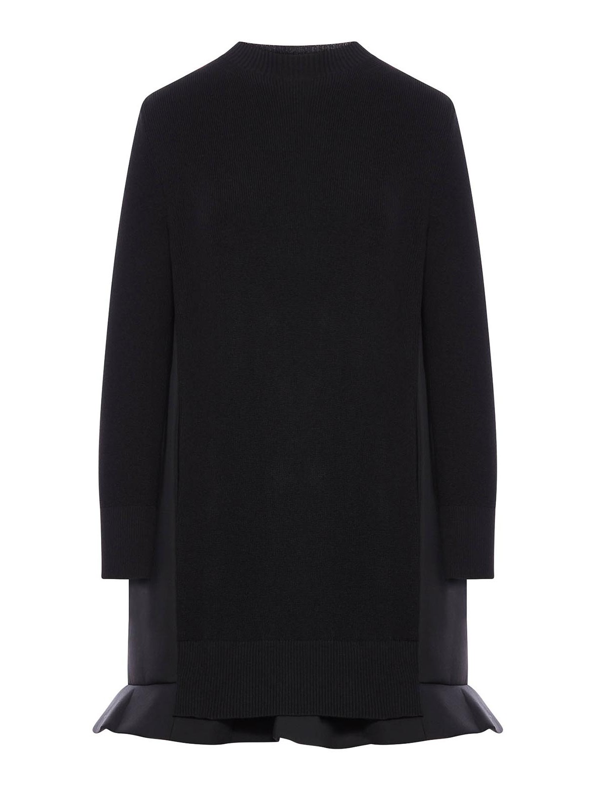 Col rond, manches longues, coupe carrée, ourlet volanté, fentes arrière, poches passepoilées, col et poignets côtelés, couleur noire