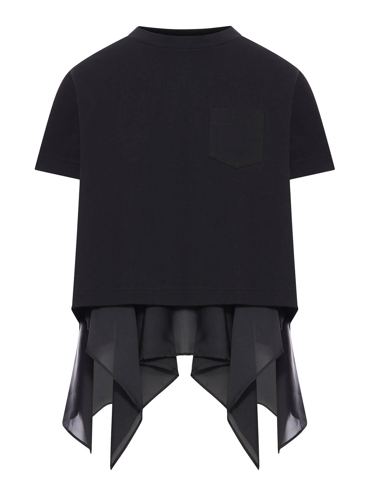 Col rond- manches courtes- poche plaquée- fente au dos- couche inférieure avec ourlet asymétrique- couleur noire