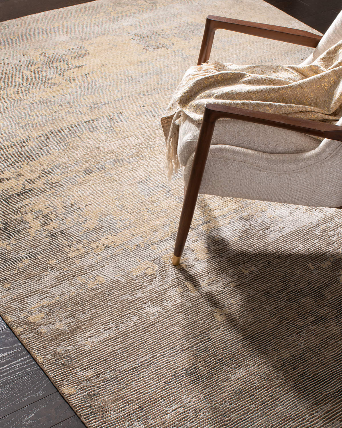 Transitional, handmade rug. Handknotted wool, cotton, and viscose. Size is approximate. We recommend use of a rug pad (not included). Imported.