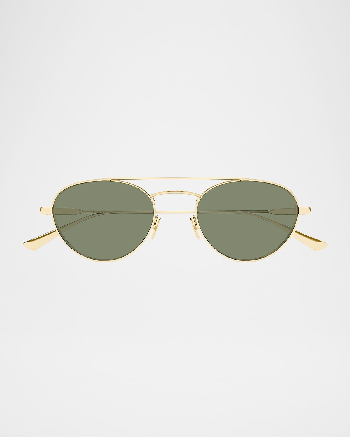 Crafted of metal, the "SL 97" sunglasses by Saint Laurent flaunt a sleek, suave design with a doublenose bridge. Lens/bridge/temple (in mm): 5120145 Aviator frames with brow bar Solid lenses Adjustable nose pads Thin, tapered arms Includes case and cleaning cloth 100% UVA/UVB protection Made in Italy
