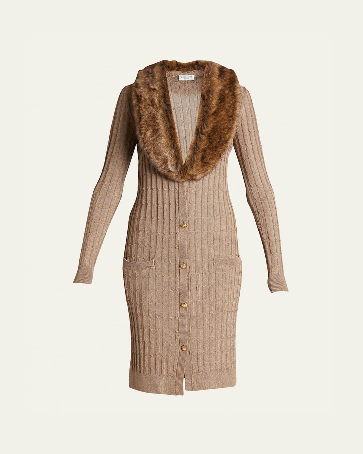 Saint Laurent cableknit cardigan with faux fur (viscose/polyester) trim Plunging V neckline; button front Long sleeves Front patch pockets Slim fit Mid length Viscose/polyester Made in Italy