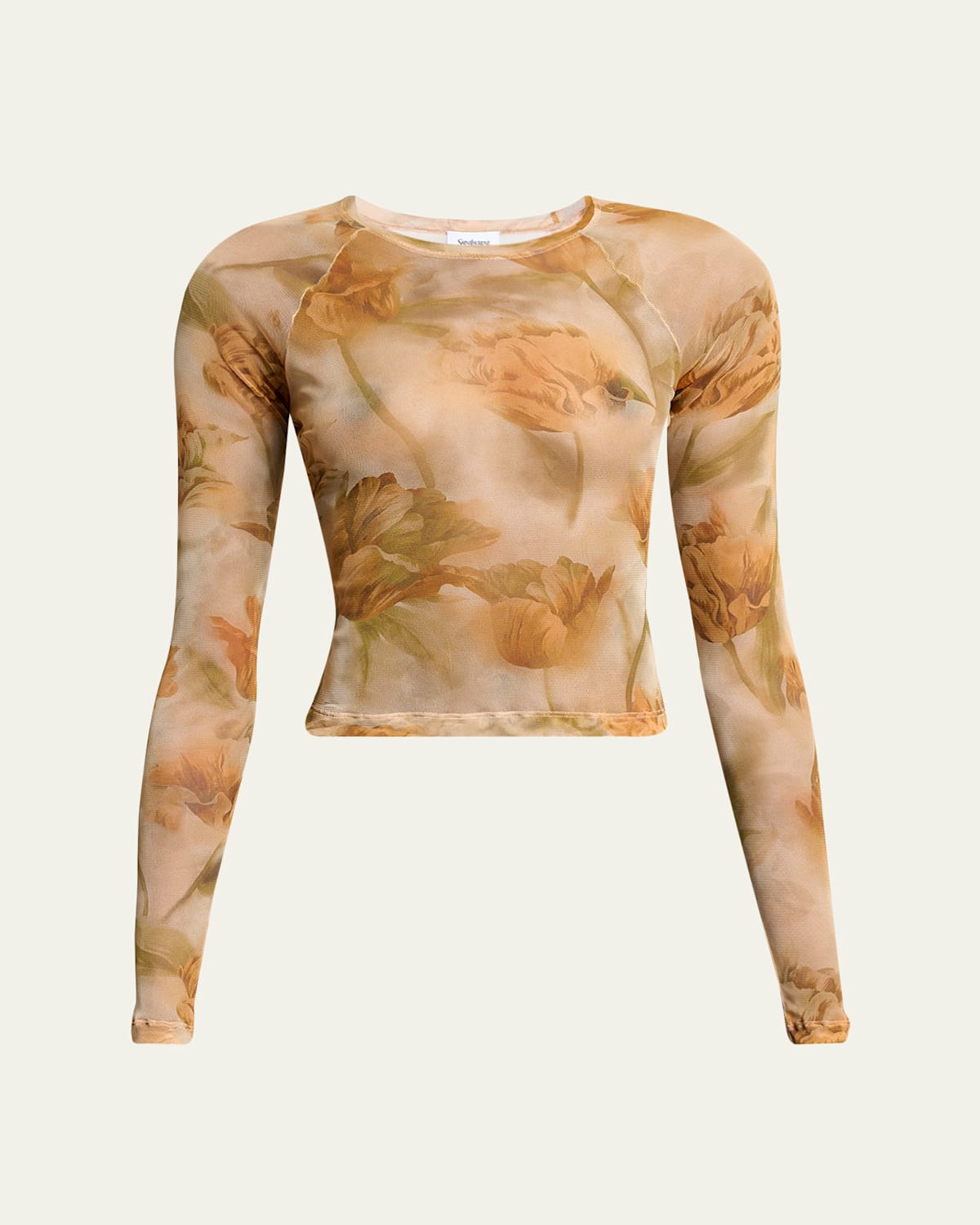 Saint Laurent top is crafted of mesh featuring a blurry floral print Crew neckline Long raglan sleeves Fitted Pullover style Nylon/polyamide Made in France
