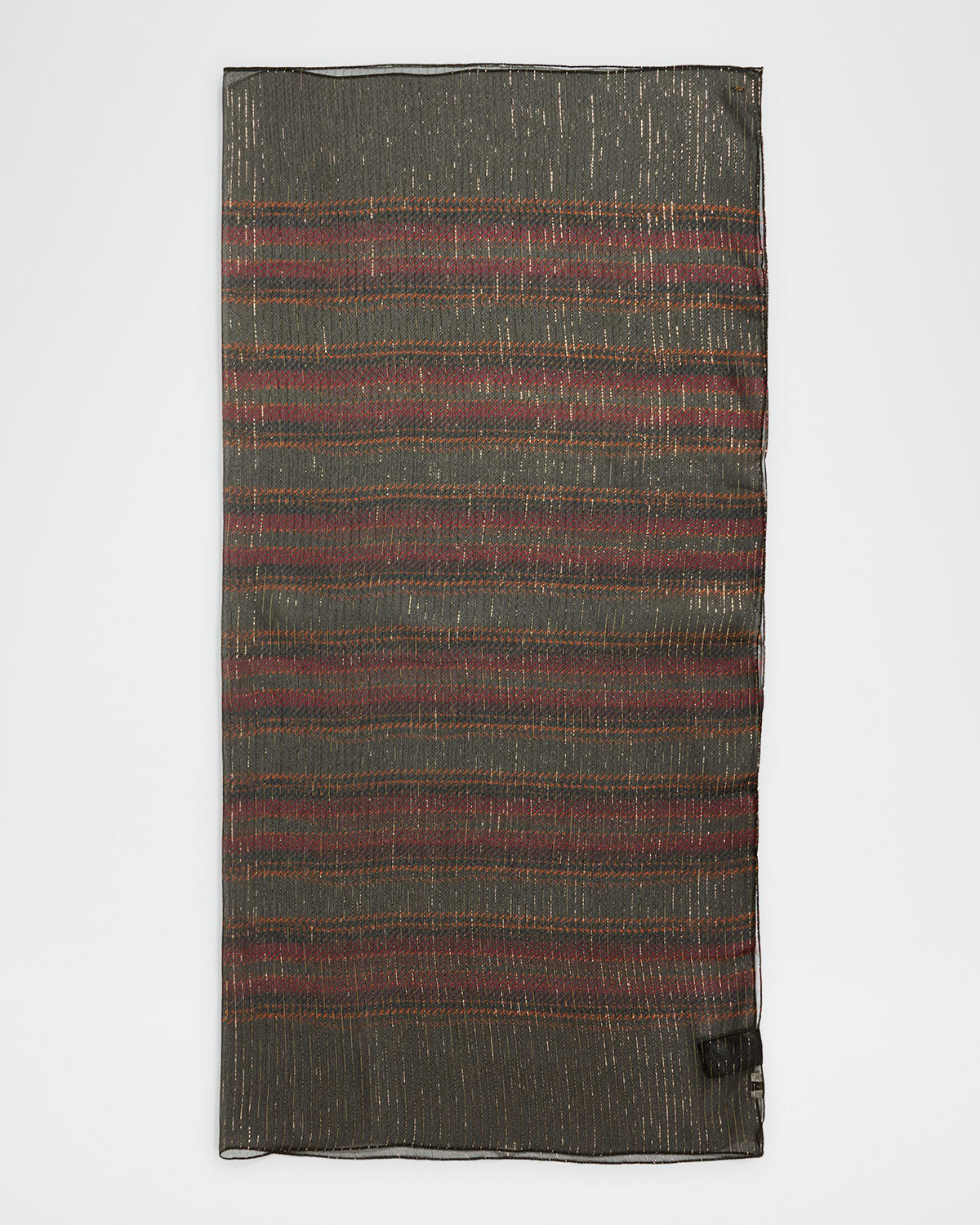 Saint Laurent silk scarf embellished with gipsy stripes Approx. 53"L x 53.0"W Gold logo plaque at the hem Rolled hem Can be styled multiple ways Silk/polyurethane Made in Italy