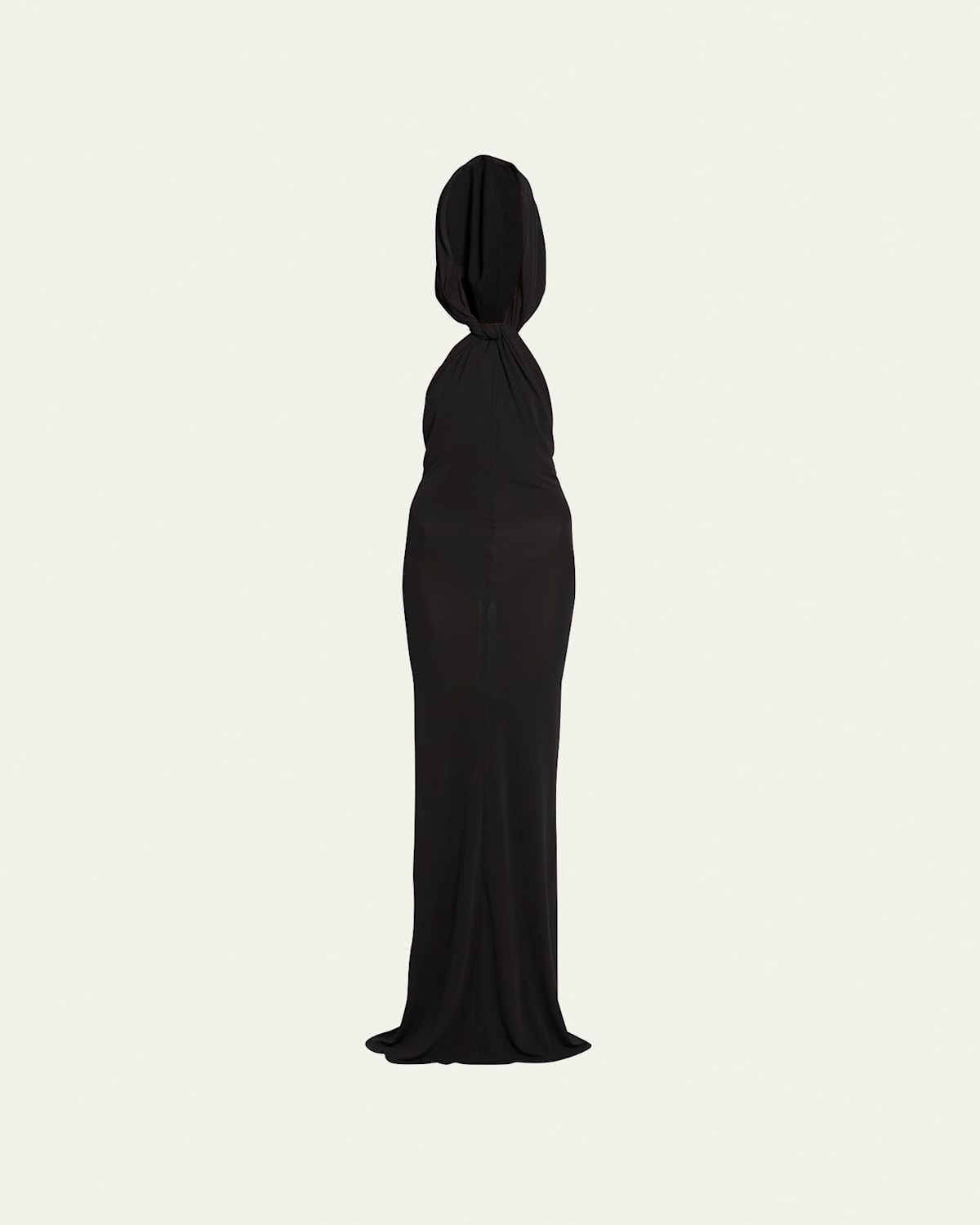 Saint Laurent solid gown with openback Halter hooded neckline Sleeveless Column silhouette Floor length Slipover style Viscose Made in France