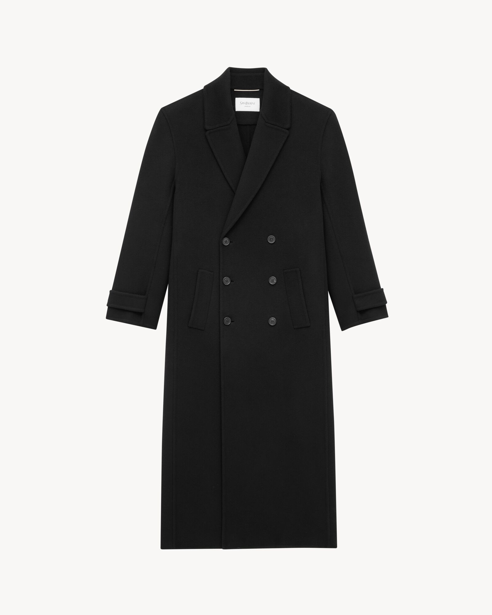 double-breasted, six-button long coat made with double-face certified cashmere and certified wool, featuring a notched collar, broad shoulders and tab cuffs.