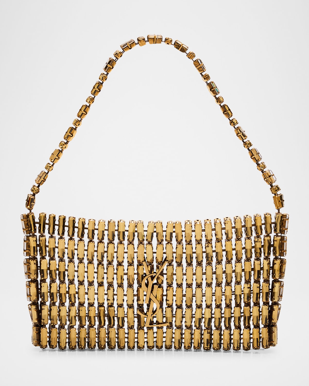 Saint Laurent's evening shoulder bag, a dazzling masterpiece in mesh beaded brass, captures the essence of elegance with every shimmering detail. Features signature YSL logo lettering Shoulder strap, 6.2"L Open top Golden hardware Approx. 2.9"H x 7.1"W x 1"D Made in Italy