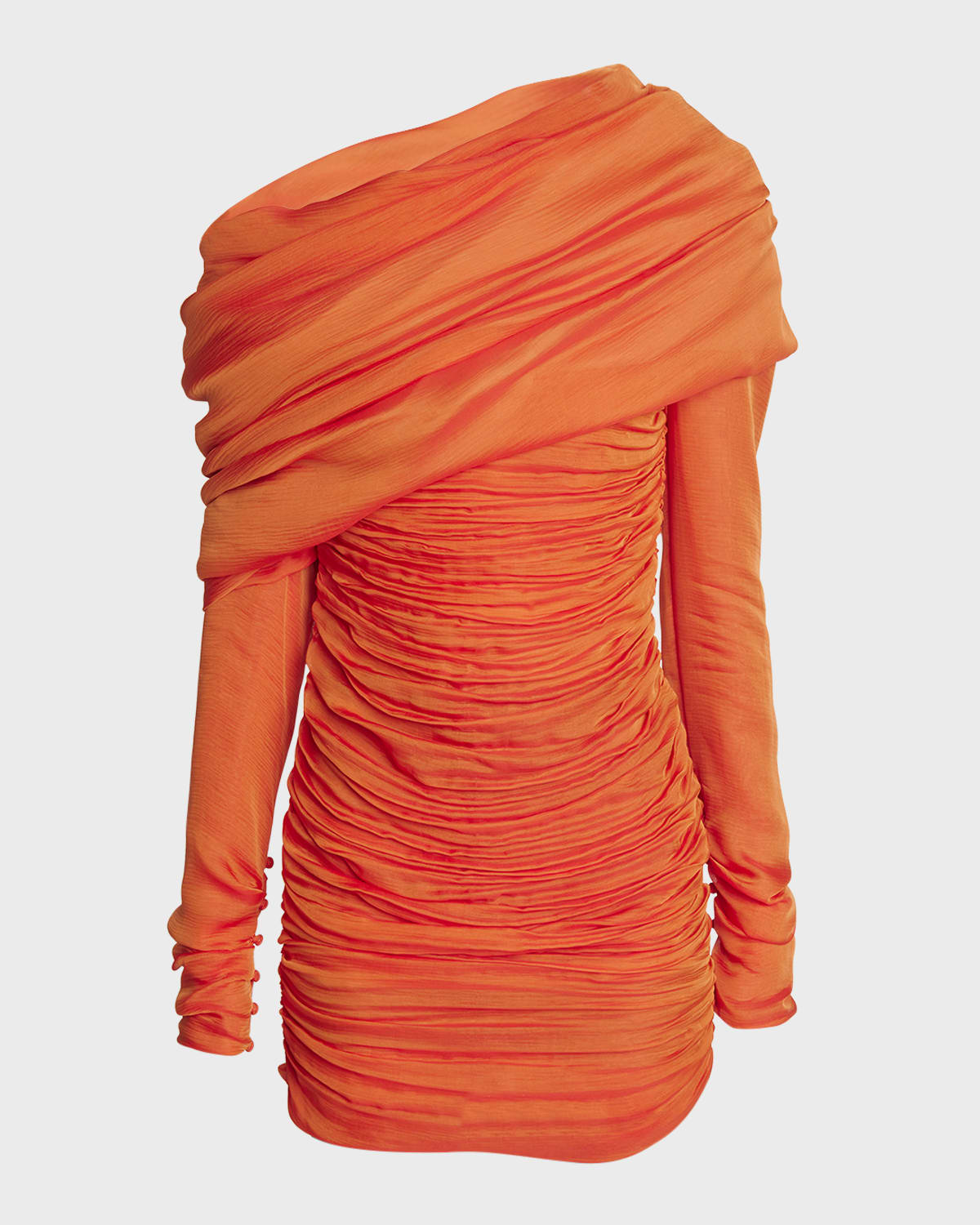 Ruched Long-Sleeve One-Shoulder Mini Dress