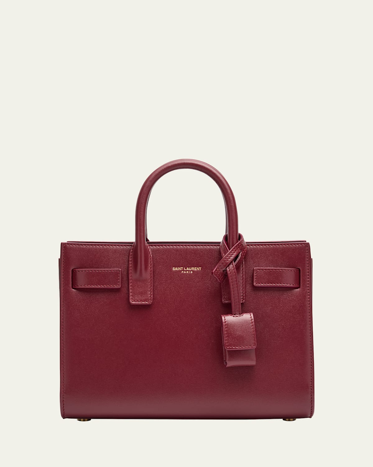 Saint Laurent satchel bag in shiny smooth calf leather Rolled top handles; removable tag charm Can be worn over the shoulder or across the body Detachable, adjustable shoulder strap, 21" drop Belted front cinches gusset sides Open top for easy, onthego access Bronze hardware. Feet protect bottom of bag Interior, one zip pocket, one slip pocket Approx. 7"H x 8.6"W x 4.1"D "Sac de Jour" is made in Italy