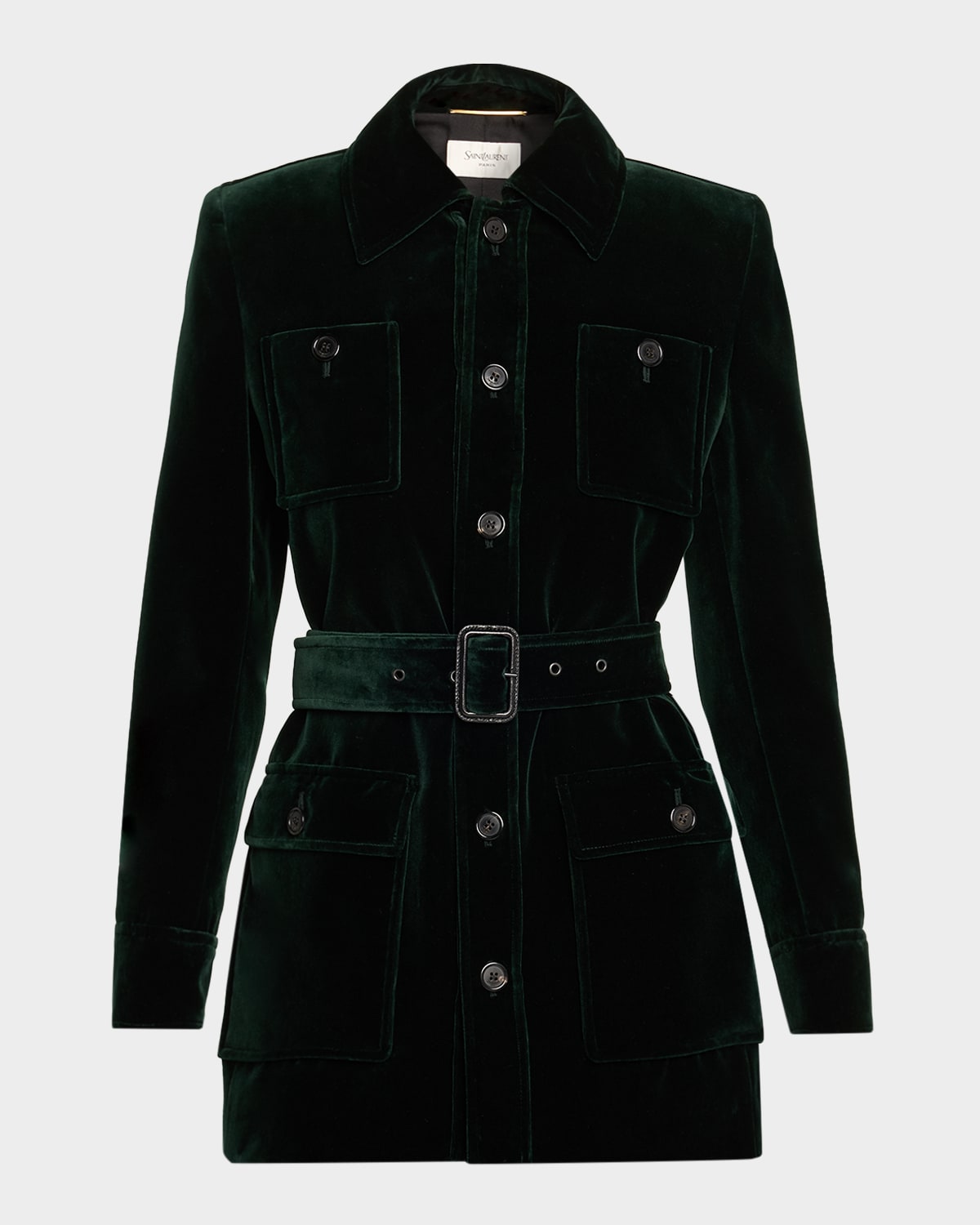 Crafted of certified cotton velvet, this Saint Laurent safari tunic jacket blends elegance with utilitarian style. Point collar Long sleeves with twobutton cuffs Four front flap pockets Two inner jetted pockets Adjustable and removable belt Tunic length Button front closure Cotton Silk lining Made in Italy