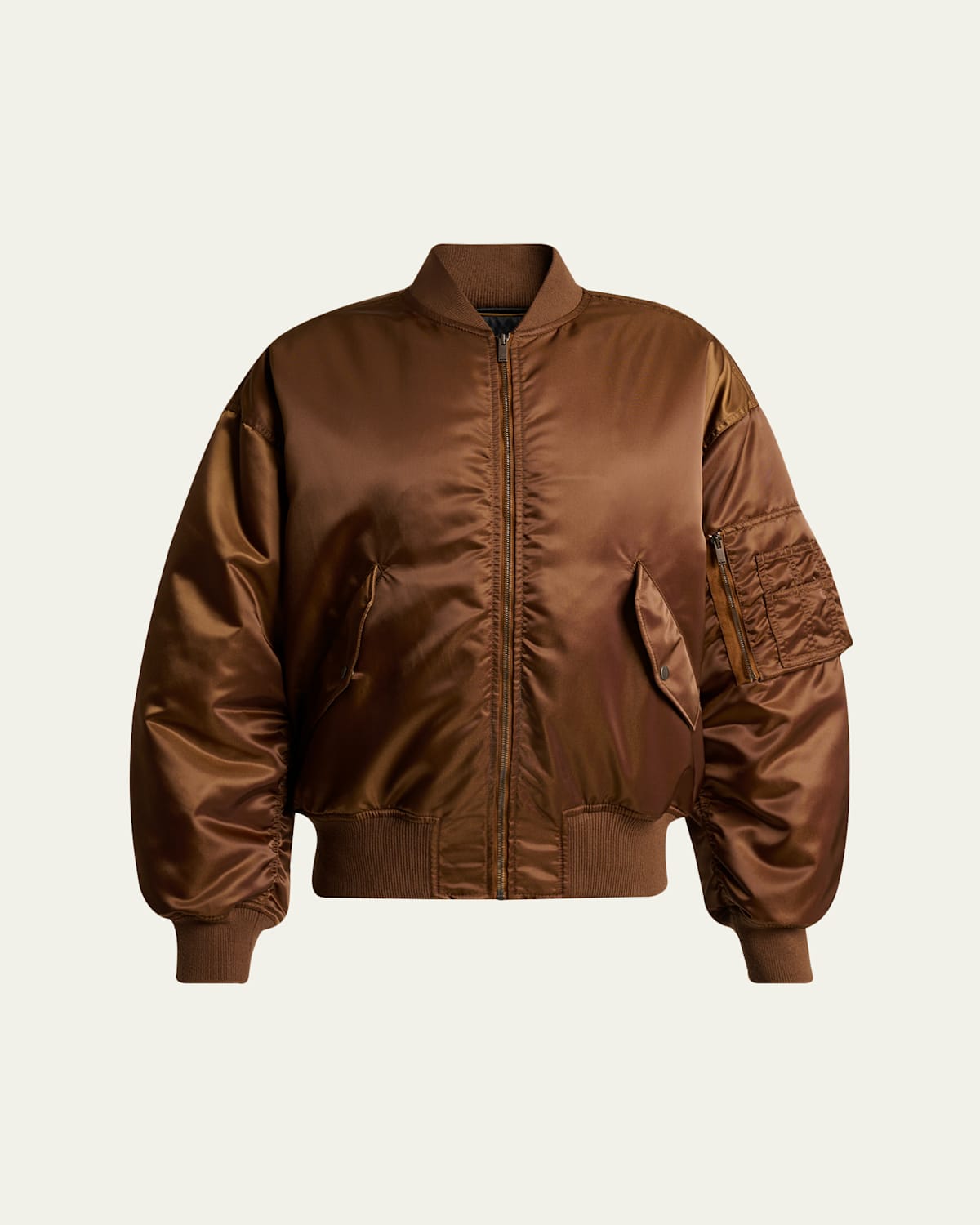 Saint Laurent bomber jacket is crafted of a shiny satin featuring ruched sleeves and a utility zip pocket on the left sleeve Baseball collar; zip front Long sleeves Hip snapflap pockets Loose fit Hip length Banded cuffs and hem Nylon/polyamide/acrylic/wool Made in Italy