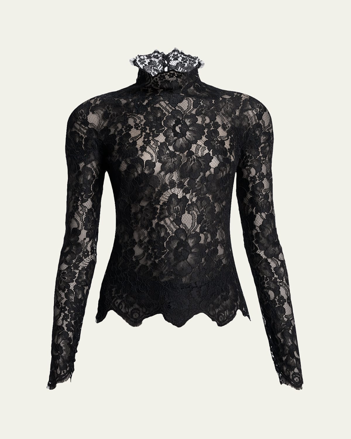 Saint Laurent top is crafted of a sheer lace with scalloped edges Turtleneck Long sleeves Fitted Button back closure Cotton/viscose/nylon/polyamide Made in Italy