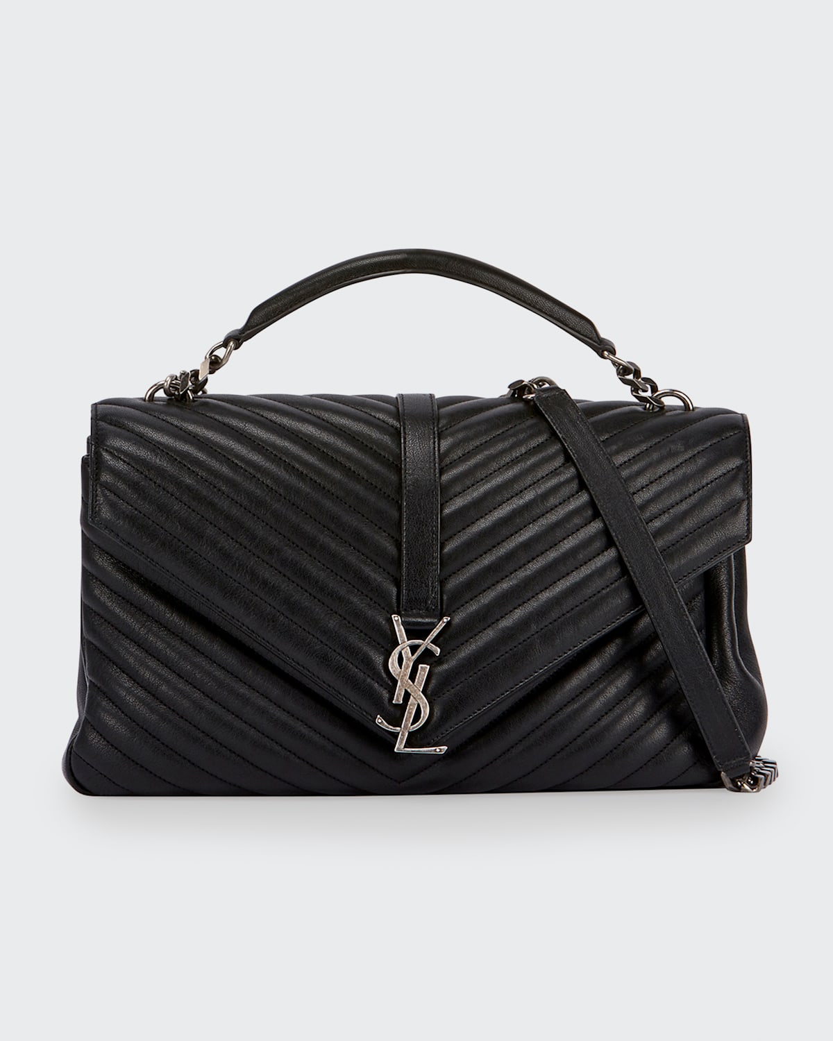 Saint Laurent quilted leather shoulder bag with goldtone hardware. Padded top handle anchored by chains. Chain and flat shoulder strap, 11.8" drop. Envelope flap with YSL logo; snap closure. Interior features pockets. 8.7"H x 12.2"W x 3.2"D. Made in Italy.