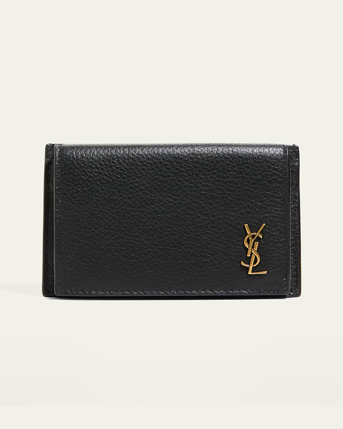 Saint Laurent card case in grained calf leather. YSL logo medallion. Bronze hardware. Flap top with snap closure. Exterior, two card slots. Approx. 2.8"H x 4.1"W x 0.2"D. Made in Italy.