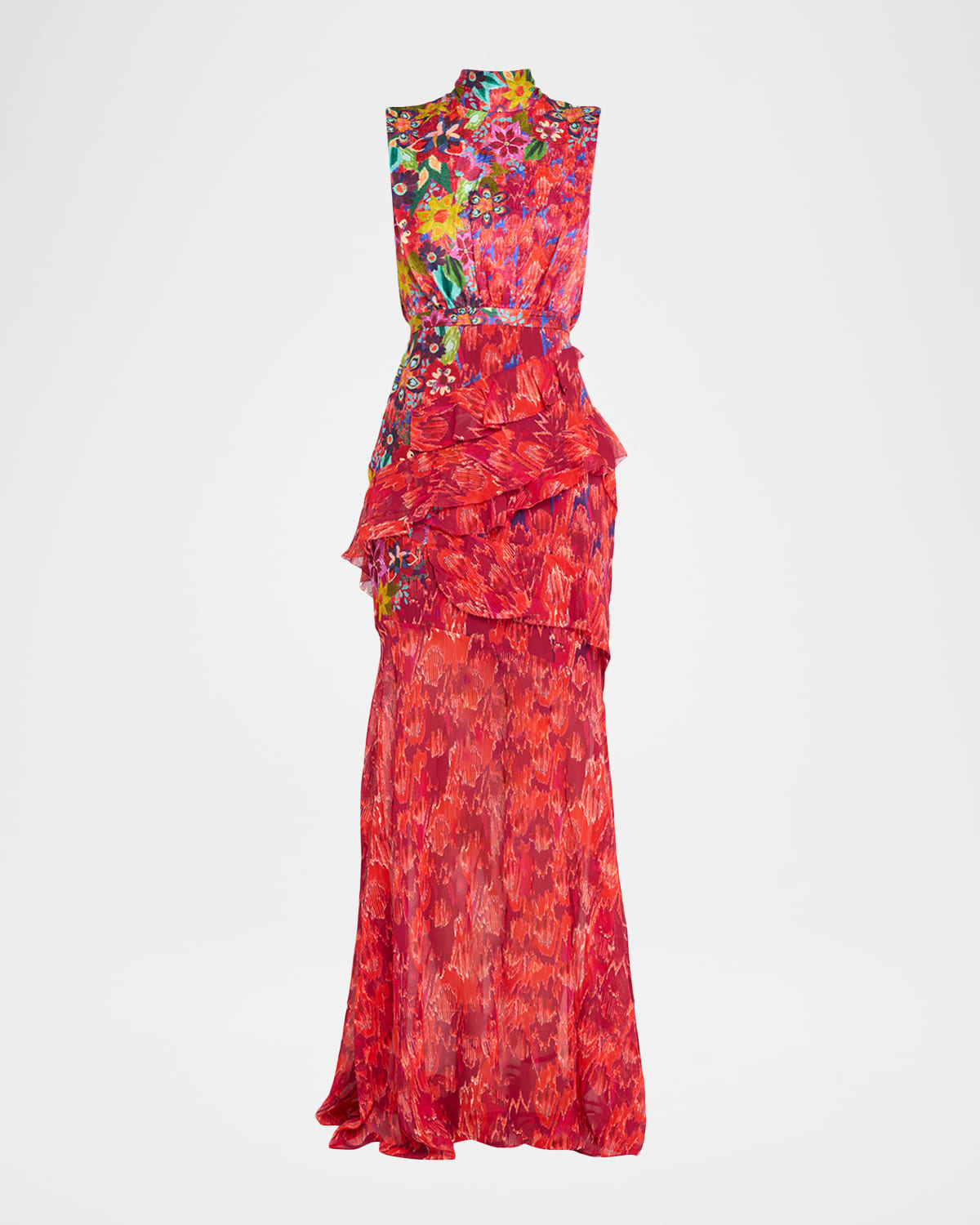 Crafted in cracklestamped satin and silk georgette, the "Fleur" gown by Saloni boasts a signature silhouette accented with an Astilbe Garden print and feminine ruffles. High neckline Sleeveless Flowing silhouette Full length Invisible center back zip; hookandeye closure Silk Lining: Polyester Dry clean Imported